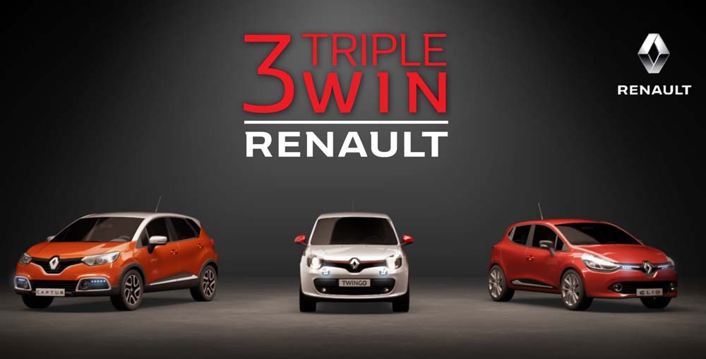 Τώρα μέσω του Renault Triple Win, ο κάθε αγοραστής μπορεί να αποκτήσει το Twingo, Clio / Clio Sport Tourer ή Captur που επιθυμεί μέσω ενός εξαιρετικά ελκυστικού πακέτου, με οφέλη (χρηματική έκπτωση, δωρεάν επέκταση εργοστασιακής εγγύησης, δωρεάν ασφάλιση, κτλ.) που προσαρμόζονται σύμφωνα με τις ανάγκες του.
