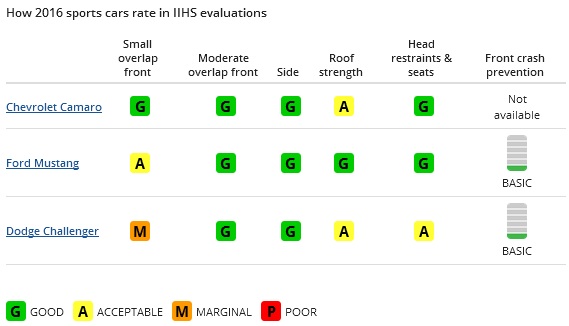 Η Chevrolet από την πλευρά της μπορεί να επιδείξει τα καλά αποτελέσματα του Camaro στο small overlap test (εκεί που η Mustang έχασε κάποιους βαθμούς), αλλά από την άλλη δυσκαμψία της οροφής υπολείπεται σημαντικά, ενώ δεν διαθέτει και κάποιο σύστημα προειδοποίησης και αποφυγής ή μείωσης των συνεπειών μιας μετωπικής σύγκρουσης. Το Dodge Challenger πέτυχε τη δεύτερη χειρότερη επίδοση στα small overlap tests καθώς ο τροχός μετατοπίστηκε προς την καμπίνα των επιβατών παγιδεύοντας ουσιαστικά τα πόδια του οδηγού. Ενδεικτικό είναι πως προκειμένου να «απελευθερώσουν» το ανδρείκελο οι μηχανικοί έπρεπε να ξεβιδώσουν το πέλμα του.