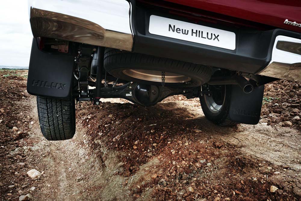 Το σύστημα πίσω ανάρτησης του νέου Hilux με ανθεκτικά ελατήρια με φύλλα σούστας και διπλά αμορτισέρ έχει αναθεωρηθεί εκτενώς για να συνδυάζει τις εκτός δρόμου ικανότητες – αντίστοιχες ενός AWD επαγγελματικού εργαλείου – με την οδηγική άνεση και ευστάθεια ενός SUV.
