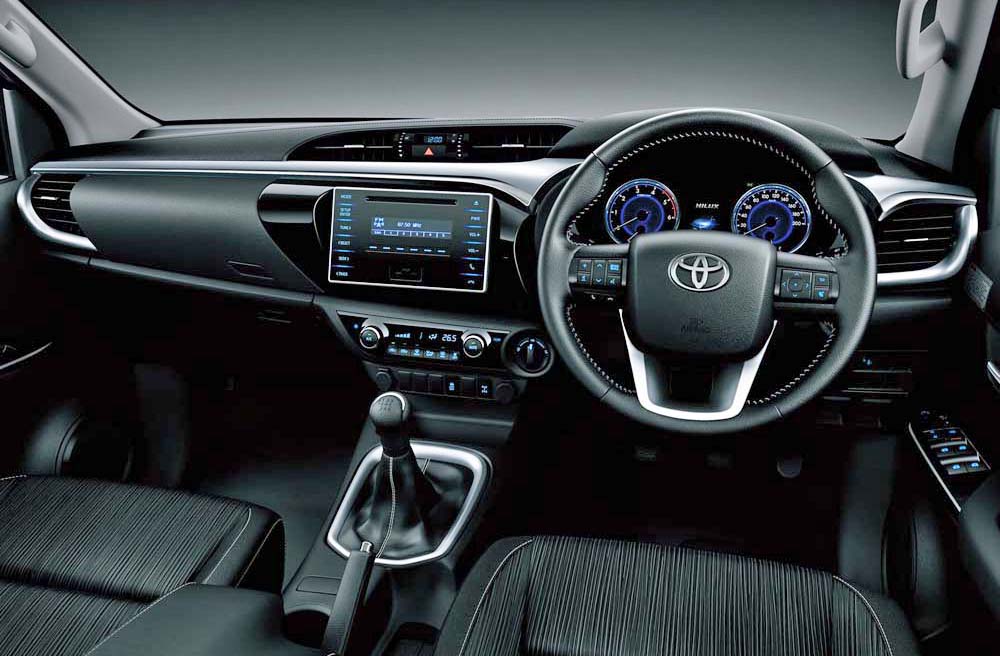 Η εμφάνιση και αίσθηση premium ποιότητας του εσωτερικού του νέου Hilux ενισχύεται από τα μεταλλικά ένθετα, στο ταμπλό, την επένδυση θυρών, τον πίνακα οργάνων, το τιμόνι και το πλαίσιο του λεβιέ ταχυτήτων. Επιπλέον οπτική αρμονία δημιουργείται με τη χρήση μπλε φωτισμού και κρυφού φωτισμού οργάνων.