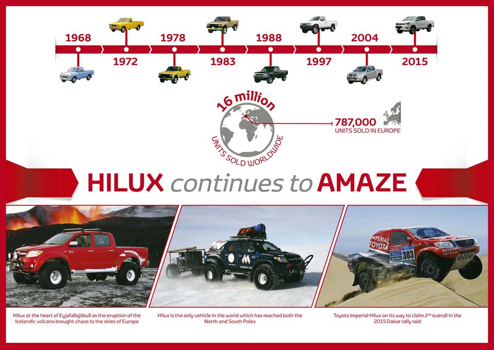 Διάσημο για το τρίπτυχο Ποιότητα, Αντοχή και Αξιοπιστία [Quality, Durability & Reliability (QDR)], το ακούραστο Hilux συνεχίζει να εντυπωσιάζει με τα κατορθώματά του στο Β. Πόλο, τα ηφαίστεια της Ισλανδίας και την ήπειρο της Ανταρκτικής, αλλά και με τους κορυφαίους τερματισμούς του στο Ράλι Ντακάρ.