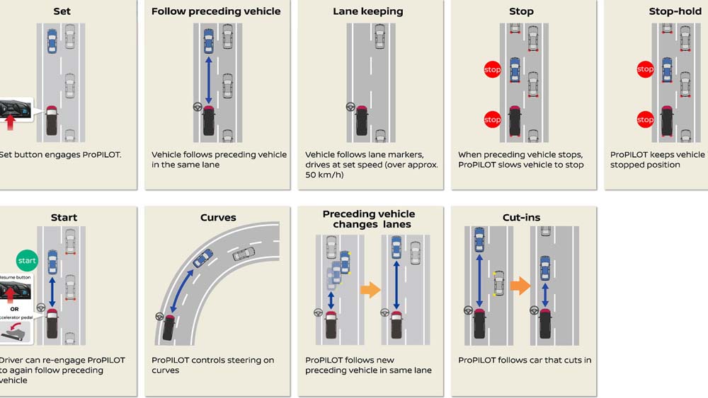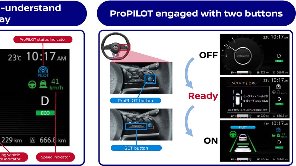 Με το ProPilot η Nissan φαίνεται πως δίνει την δική της απάντηση στο AutoPilot της Tesla (μπλέξαμε με τα… pilot!) με τους Ιάπωνες να λένε πως μέχρι το 2018 το σύστημα τους θα είναι έτοιμο να αναγνωρίζει πολλαπλές λωρίδες κυκλοφορίας. Για την ώρα το ProPilot διατηρεί αυτόνομα ην πορεία του αυτοκινήτου σε μία μονή λωρίδα ελέγχοντας πλήρως την επιβράδυνση και την επιτάχυνση του. Φυσικά, το σύστημα ελέγχει πλήρως την κατεύθυνση του αυτοκινήτου, αλλά για λόγους ασφαλείας ο οδηγός θα πρέπει να έχει τα χέρια του στο τιμόνι (σε αντίθεση με το σύστημα της Tesla). Αν τα τραβήξει, τότε το σύστημα απομπλέκεται αυτόματα, αφού έχουν γίνει οπτικές και ηχητικές επισημάνσεις.