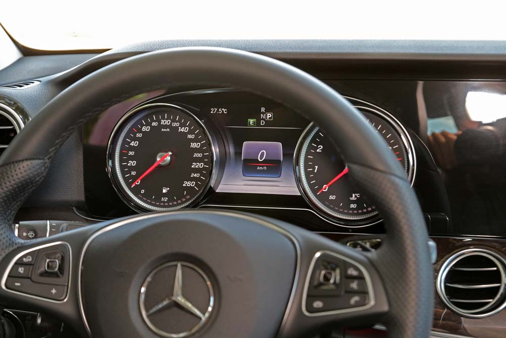 Περνάμε κάτω από το καπό όπου υπάρχει ο γνώριμος από την προηγούμενη γενιά δίλιτρος βενζινοκινητήρας BlueDirect με απόδοση 184 ίππους και 300 Nm. Έχει άμεσο ψεκασμό, είναι φυσικά υπερτροφοδοτούμενος και διακρίνεται για την απόλυτα στρωτή όσο και ροπάτη λειτουργία του (η μέση ροπή εμφανίζεται από τις 1.200 έως τις 4.000 σ.α.λ.). Αν δεν έχετε ιδιαίτερες απαιτήσεις το μοτέρ αυτό θα σας καλύψει, αφού το ελαφρύτερο σασί ευνοεί τις επιδόσεις, εδώ και με το νέο αυτόματο κιβώτιο των 9 σχέσεων. Το 9G-Tronic είναι ότι πρέπει για μία ταξιδιάρικη λιμουζίνα όπως είναι η E-Class και εστιάζει περισσότερο στην βελούδινη αλλαγή των σχέσεων για αυτό και δεν είναι από τα πιο γρήγορα που υπάρχουν. Αυτό ισχύει για τα δύο πιο cool προγράμματα (τα Eco και Comfort), αφού στα Sport και Sport+ τα πράγματα ζωηρεύουν και μαζί και οι αλλαγές των σχέσεων με πιο άμεσο kickdown και απόκριση γκαζιού.