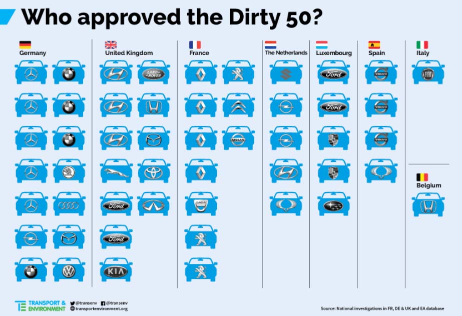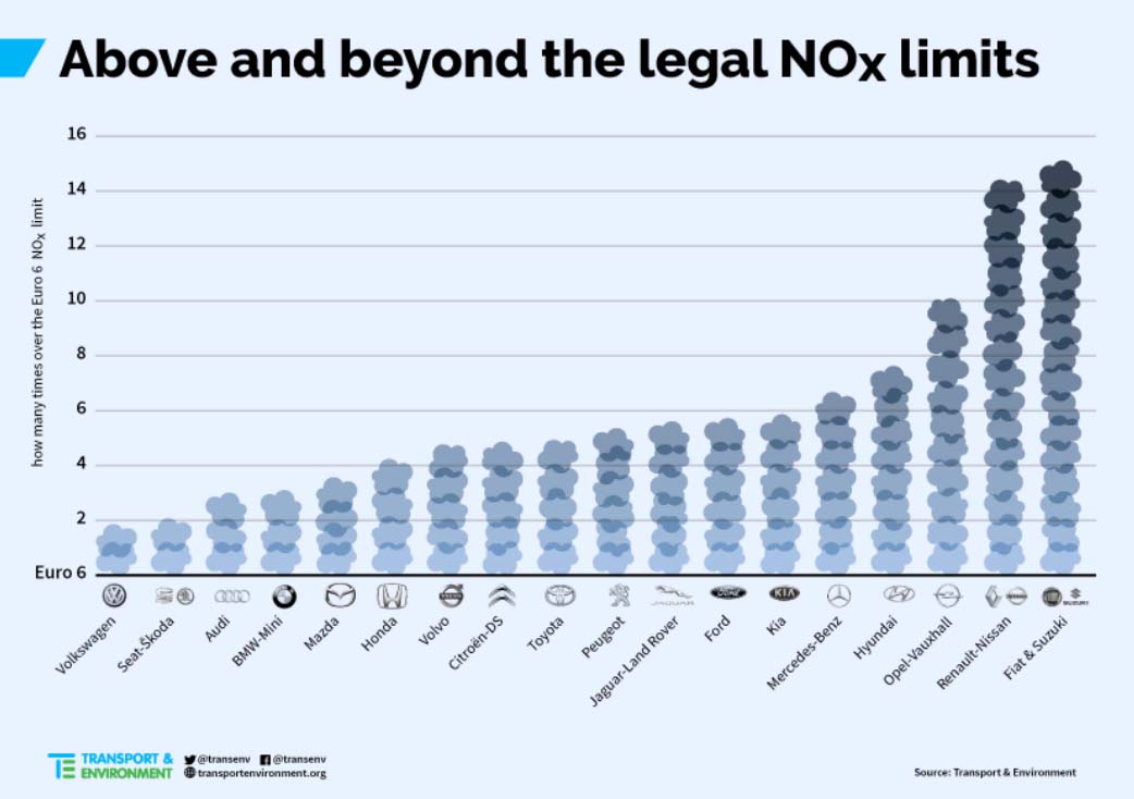 Πρωταθλητής στους ρύπους είναι οι Fiat και Suzuki όπου τα μοντέλα τους εκπέμπουν 15 φορές NOx πάνω από το επιτρεπόμενο! Ακολουθούν οι Nissan-Renault με x14 φορές, οι GM-Opel με x10, ενώ στην χαμηλότερη θέση είναι τα VW με περίπου x2 (δείτε το παραπάνω γράφημα).