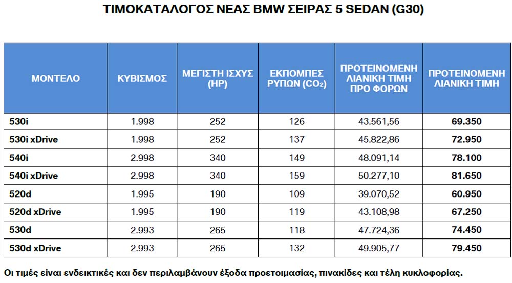 Από πλευράς διαστάσεων η G30 τοποθετείται κοντά στην απερχόμενη F10 (είναι λίγο μακρύτερη, φαρδύτερη και ψηλότερη) και απέναντι στα ανταγωνιστικά Mercedes E-Class, Audi A6 και Volvo S90. Όπως φαίνεται και στο παρακάτω πίνακα οι τιμές ξεκινούν από τα 60.950€ για την 520d (1.995 κ.εκ. με 190 ίππους), ενώ η 530d (στα 2.993 κ.εκ. με 265 άλογα) είναι διαθέσιμη από 74.450€.