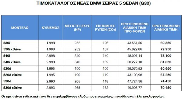 Από πλευράς διαστάσεων η G30 τοποθετείται κοντά στην απερχόμενη F10 (είναι λίγο μακρύτερη, φαρδύτερη και ψηλότερη) και απέναντι στα ανταγωνιστικά Mercedes E-Class, Audi A6 και Volvo S90. Όπως φαίνεται και στο παρακάτω πίνακα οι τιμές ξεκινούν από τα 60.950€ για την 520d (1.995 κ.εκ. με 190 ίππους), ενώ η 530d (στα 2.993 κ.εκ. με 265 άλογα) είναι διαθέσιμη από 74.450€.