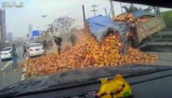 Tο βίντεο που μας έρχεται από την Κίνα δείχνει πως όταν δεν είναι η ώρα σου, τότε συνδράμουν όλες οι δυνάμεις του σύμπαντος για να μείνεις ζωντανός. Όπως βλέπουμε μία νταλίκα φορτωμένη έως πάνω με ένα φορτίο τούβλα, δεν μπορεί να φρενάρει έγκαιρα και ανεβαίνοντας στο κράσπεδο γέρνει στο πλάι. Εκεί βρίσκεται ένα επιβατικό το οποίο δέχεται πάνω του τους τόνους από τα τούβλα που κουβαλούσε η εμφανώς υπερφορτωμένη κινέζικη νταλίκα.