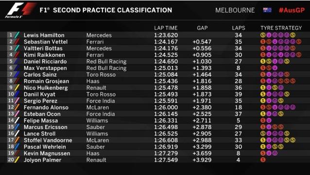 Έτσι στις ελεύθερες δοκιμές του Γκραν Πρι της Αυστραλίας ο Lewis Hamilton σημείωσε εύκολα τον καλύτερο χρόνο, χωρίς μάλιστα να πιεστεί και ιδιαίτερα. Στην πρώτη περίοδο των δοκιμών και με την μαλακή γόμα της Pirelli ο Βρετανός έκανε 1:24.2 έχοντας πίσω του τον ομόσταυλο του Bottas μπροστά από τις Red Bull. Βέβαια η Red Bull όσο και οι Ferrari χρησιμοποίησαν ενδιάμεση γόμα, στα πλαίσια του γενικότερου ψαξίματος με τα ελαστικά, εν όψει του αγώνα.