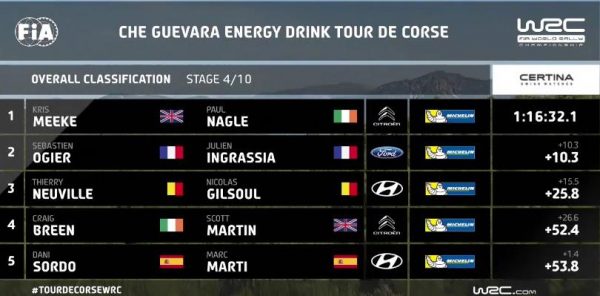 Το πρώτο σκέλος του φετινού Ράλι Κορσική ολοκληρώθηκε με τον Κris Meeke να αυξάνει ελαφρά την διαφορά του που είχε αποκτήσει στις δύο πρωινές ειδικές από τον Sebastian Ogier…