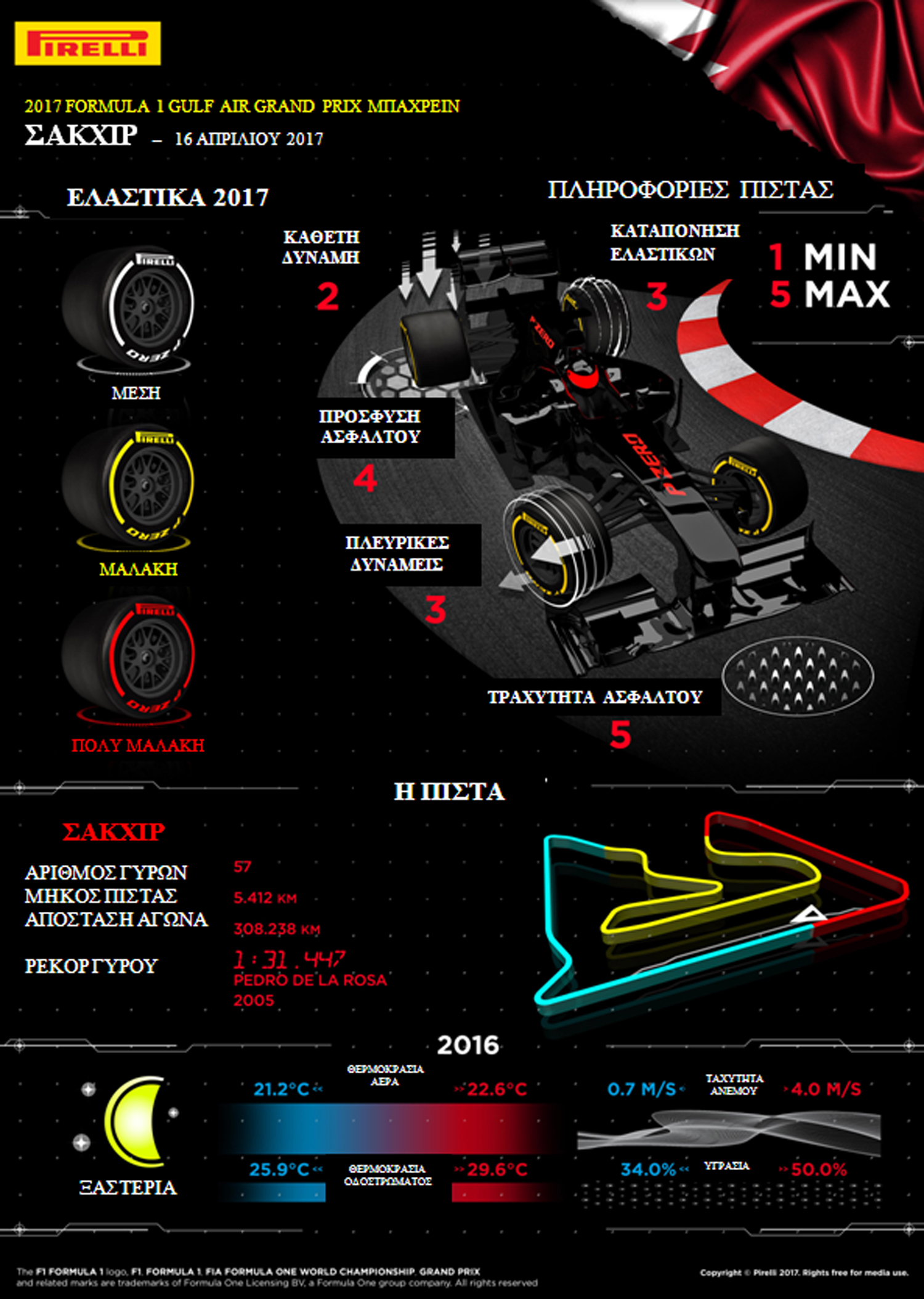 • Η Pirelli γνωρίζει καλά το Σακχίρ εκεί γίνονται δοκιμές εξέλιξης για πολλές μορφές αγώνων.