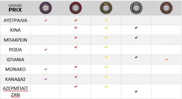 • Για τους πέντε πρώτους αγώνες όλοι οι οδηγοί έχουν στη διάθεσή τους τις ίδιες γόμες ελαστικών: Επτά από την πιο μαλακή, τέσσερις από τη μεσαία και δυο από την σκληρότερη εκ των διαθεσίμων γομών