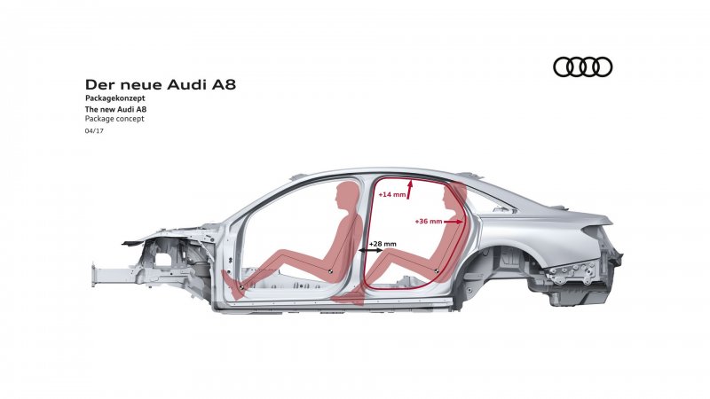 Η Audi επένδυσε σημαντικά ποσά στο εργοστάσιο στο Neckarsulm, όπου κατασκευάστηκε μία νέα γραμμή παραγωγής για το A8 απασχολώντας περίπου 500 άτομα και άλλα τόσα ρομπότ σε τρεις βάρδιες. Από τα σκίτσα το ισχυρό σχεδιαστικά ατού και του νέου A8 θα είναι η μάσκα, ενώ οι χώροι θα είναι μεγαλύτεροι για τους πίσω επιβάτες (κατά 28 χιλιοστά για τα γόνατά τους και 14 χιλιοστά πάνω από τα κεφάλια τους). Οι πίσω πόρτες επίσης θα έχουν μεγαλύτερο άνοιγμα για πιο εύκολη είσοδο και έξοδο από το εσωτερικό του. Οι αριθμοί αυτοί αφορούν την απλή έκδοση, ενώ η έκδοση A8L με το μεγάλο μεταξόνιο όπως είναι φυσικό θα έχει πολύ πιο άνετο σαλόνι.