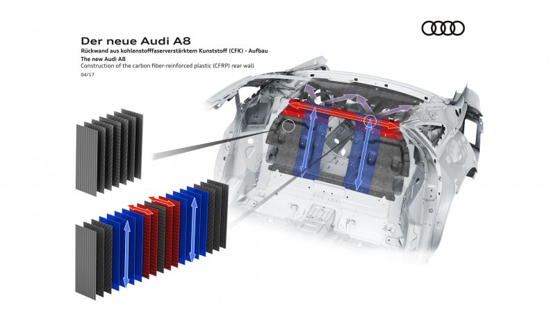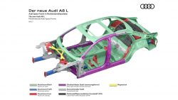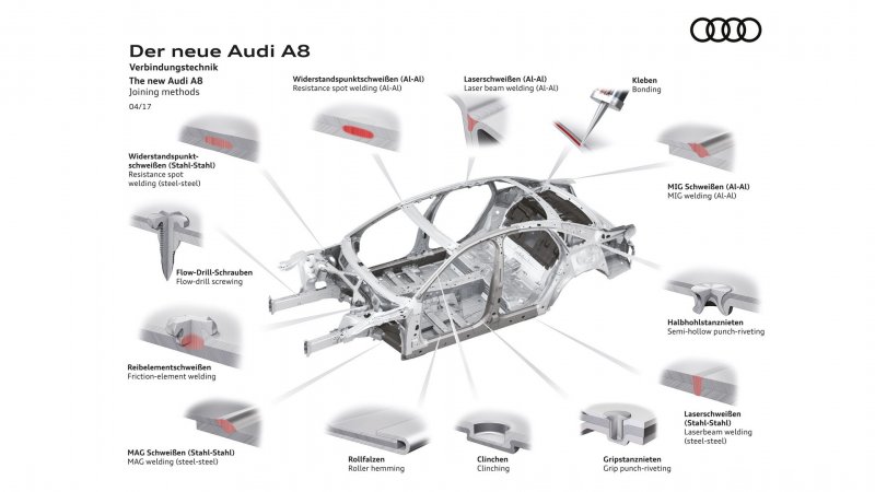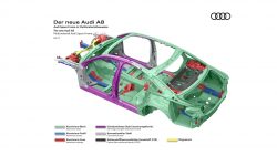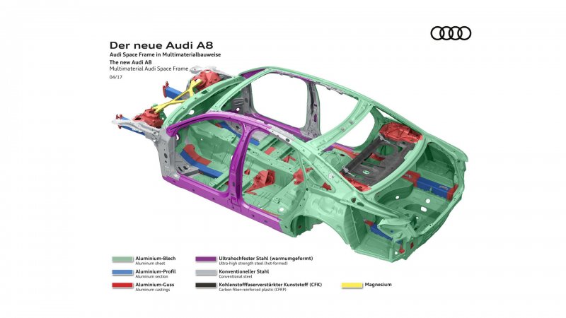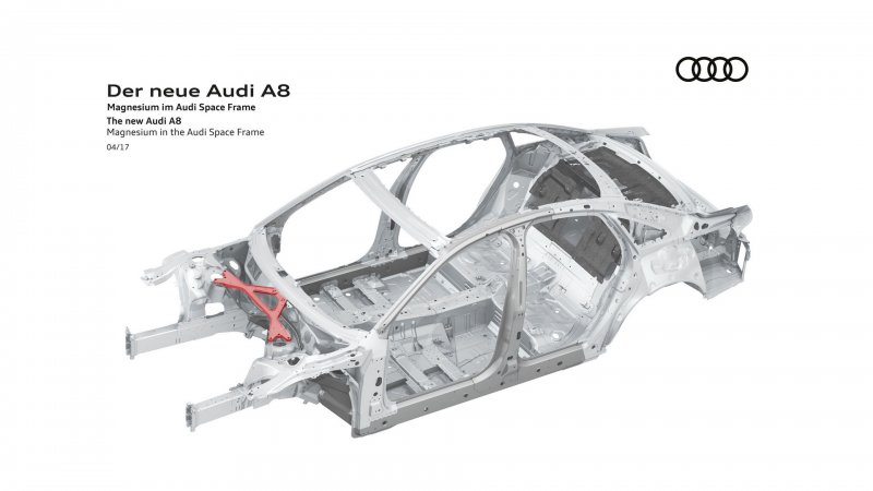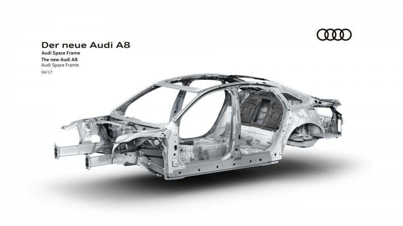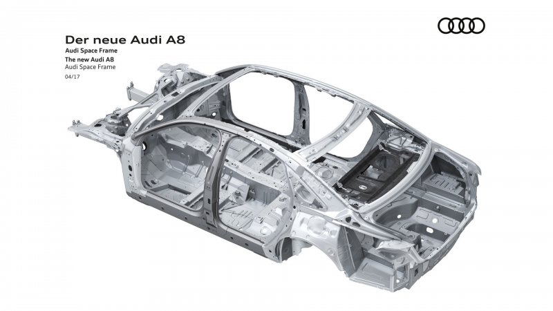 Για αρχή η Audi μας «σερβίρει» ένα πλήρες πακέτο για το ολοκαίνουργιο αλουμινένιο πλαίσιο του A8, την γνωστή ναυαρχίδα που θα αντιμετωπίσει την BMW Σειρά 7 και την ανανεωμένη Mercedes-Benz S-Class που παρουσιάστηκε στην Σαγκάη. Πριν από 24 χρόνια το A8 ήταν το πρώτο πεδίο εφαρμογής της τεχνολογίας Audi Space Frame και το πρώτο αυτοκίνητο παραγωγής με αλουμινένιο πλαίσιο.