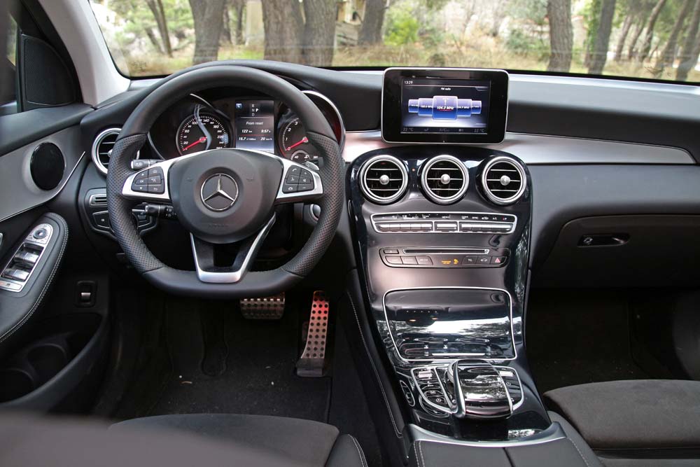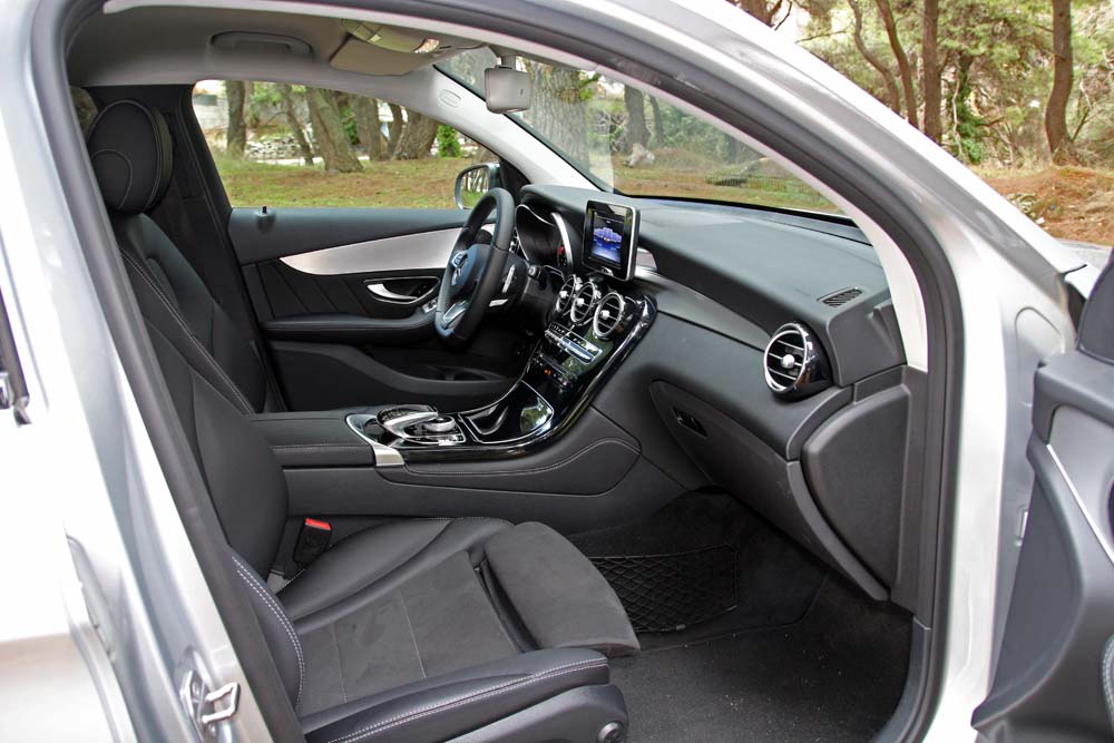 Χωροταξικά το πορτμπαγκάζ έχει κουτσουρευτεί σε μικρό βαθμό, αφού είναι μικρότερο μόνο κατά 50 λίτρα (πάντοτε σε σύγκριση με την GLC και τα 550 λίτρα της για τις αποσκευές, και εδώ η πόρτα είναι ηλεκτρικά υποβοηθούμενη). Τώρα, από τις μπροστινές θέσεις το ταμπλό είναι το γνωστό και πανομοιότυπο των GLC και με την περίσσεια λάκκας σε διάφορα σημεία, ενώ λόγω του μικρότερου παρμπρίζ και την μικρότερη γωνία των εμπρός κολόνων η ορατότητα προς τα έξω και πίσω είναι λογικό να μετριάζεται ως ένα βαθμό.
