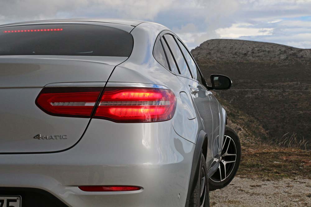 Μετά τις νορμάλ GLC 220d & GLC 250 έφτασε η ώρα να ρίξουμε… το φακό μας και πάνω από την κομψή κουπέ εκδοχή που αποτελεί τον βασικό αντίπαλο της BMW X4 (η GLE Coupe τοποθετείται απέναντι στην BMW X6). Και θα έλεγα πως το πολύ ενδιαφέρον σχεδιαστικό μοτίβο που έχει υιοθετήσει στα πιο πρόσφατα μοντέλα της η Mercedes, εδώ αποτυπώνεται με τον ομορφότερο τρόπο συνθέτοντας ένα συμπαγές και δυναμικό στην όψη σύνολο. Μάλιστα η κουπέ είναι ακόμη μακρύτερη από την νορμάλ GLC (συγκεκριμένα κατά 8 εκατοστά), έτσι ώστε η κλίση της οροφής (υπολείπεται σε ύψος κατά 4 εκατοστά) να σβήνει αρμονικά μέχρι και το μικρό πίσω κρύσταλλο.