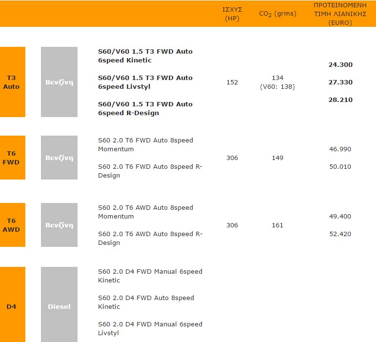 Αναλυτικότερα οι προτεινόμενες τιμές λιανικής για το Volvo S60 στον πίνακα που ακολουθεί. Σημειώνεται ότι στην έκδοση Τ3 με τον βενζινοκινητήρα των 1.498 κ.εκ. των 152 ίππων και το στάνταρ αυτόματο κιβώτιο ταχυτήτων έξι σχέσεων, τα S60 και V60 έχουν ίδια προτεινόμενη τιμή λιανικής για αντίστοιχες εκδόσεις εξοπλισμού: