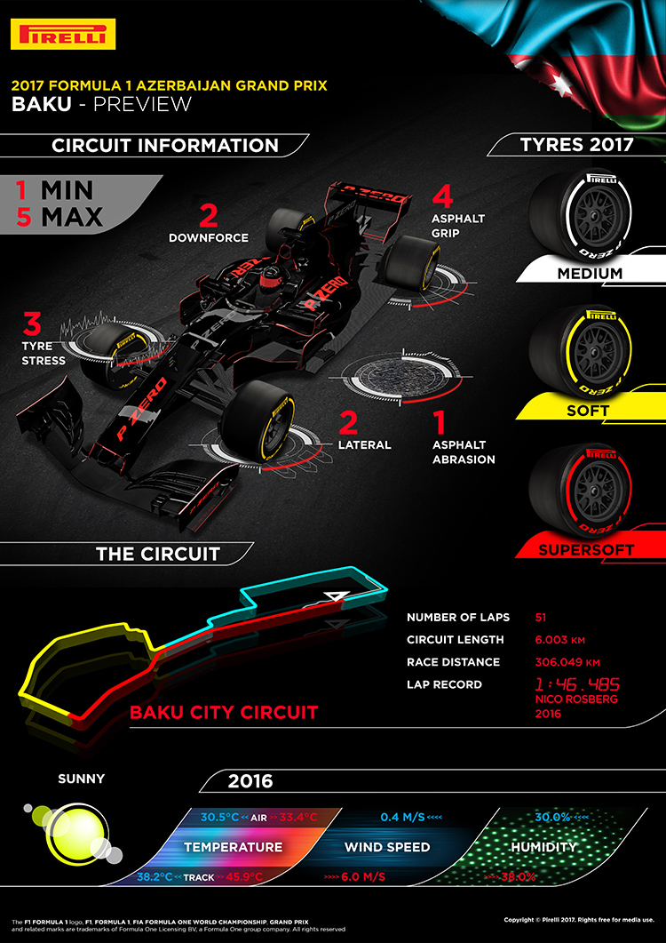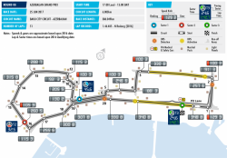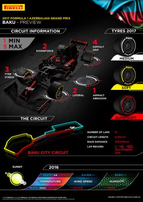 Η γρηγορότερη διαδρομή πόλης στον κόσμο διατρέχει τους δρόμους της Αζέρικης πρωτεύουσας συνδυάζοντας μία από τις μεγαλύτερες ευθείες με ένα από πιο κλειστά σημεία του καλεντάρι. Η τελική ταχύτητα στο τέλος της ευθείας των pits ξεπερνά τα 360 χλμ/ωρα, ενώ τα φαρδύτερα μονοθέσια του 2017 αναμένεται να δοκιμάσουν την ακρίβεια των οδηγών στο στενό σύμπλεγμα των στροφών 8-9-10.