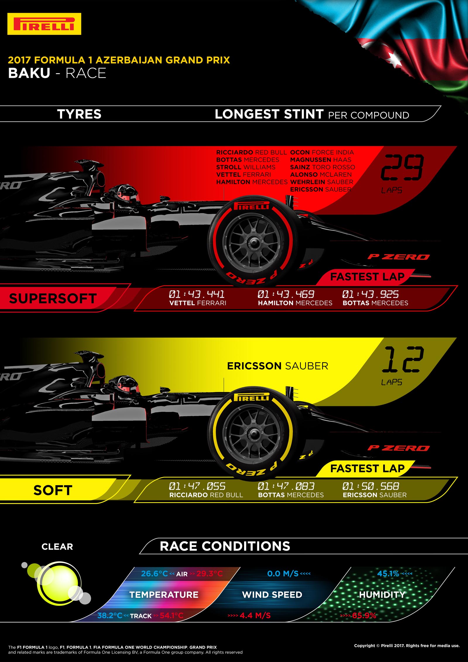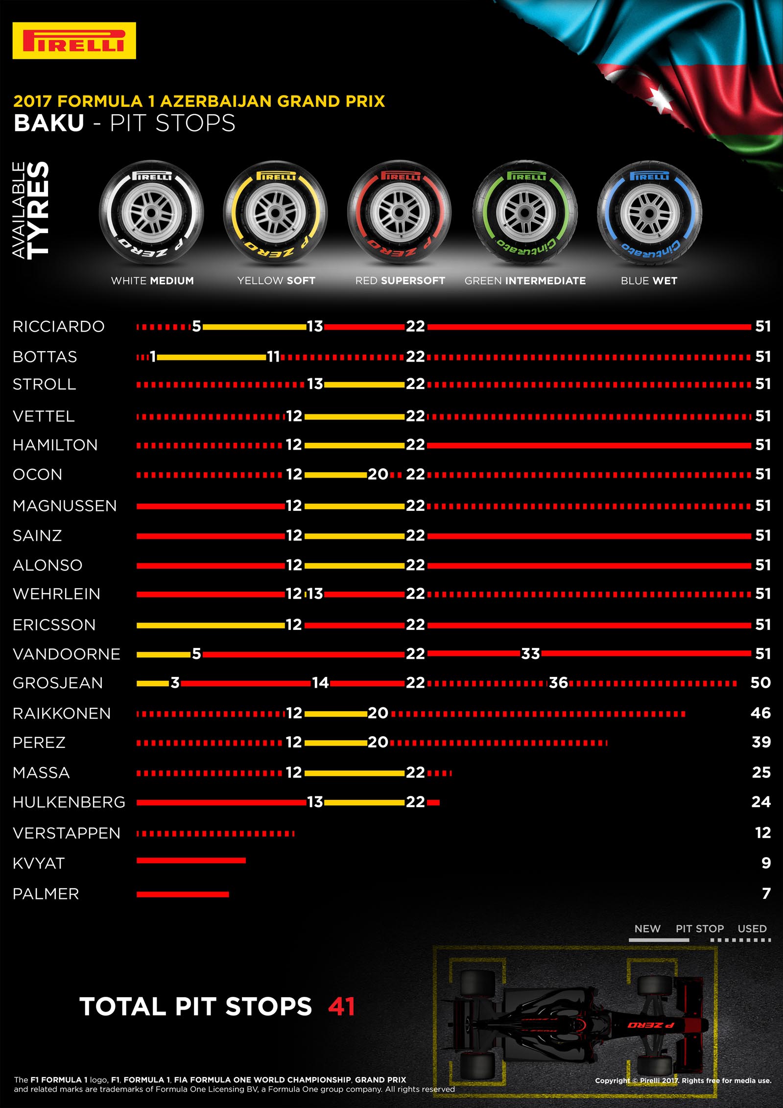 Λίγο νωρίτερα είχε λάβει χώρα κάτι φαινομενικά ασήμαντο που έμελλε, όμως, να αλλάξει τη ροή του αγώνα. Στον 10ο  γύρο θα εγκατέλειπε ο Kvyat με ηλεκτρική βλάβη παρκάροντας την STR12 στην έξοδο του συμπλέγματος του κάστρου. Λόγω της χάραξης της πίστας και ύστερα από 2 γύρους θα έβγαινε το safety-car. Όλοι μπήκαν αμέσως στα pits για αλλαγή σε soft ενώ και ο Ricciardo μπήκε για δεύτερη φορά επιστρέφοντας στα super soft. Μόνη εξαίρεση ο Stroll που θα σταματούσε έναν γύρο αργότερα. Με την επανεκκίνηση στον 17ο γύρο ο Vettel κράτησε μετά βίας τη 2η θέση από τον Perez ενώ ο Raikkonen έχασε δύο θέσεις από τους Massa και Ocon. Η SF70H του Φιλανδού έχανε κομμάτια από το πάτωμα και του πλαϊνούς αεροφράκτες-ενθύμιο της σύγκρουσης με τον Bottas. Το safety car θα έβγαινε για δεύτερη φορά ενώ μετά την επανεκκίνηση στον 20 γύρο οι δύο Force India θα συγκρούονταν στην στροφή 2 καθώς ο Ocon θα προσπαθούσε να επωφεληθεί από το χαμένο momentum του Perez που είχε πέσει τέταρτος ύστερα από πολύ ωραίο προσπέρασμα του Massa. Θύμα των θραυσμάτων που άφησαν οι Force India ήταν ο Raikkonen του οποίου ο αγώνας φάνηκε να λαμβάνει τέλος με κλατάρισμα πίσω ελαστικό και σοβαρή ζημιά στο πάτωμα. Το ίδιο φάνηκε να ισχύει και για τον Perez με σπασμένο μέρος της εμπρός αριστερής ανάρτησής του. Τα θραύσματα στην πίστα ήταν πλέον πολλά και αγώνας έπρεπε να διακοπεί στον 22ο γύρο.