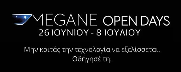 Με τα MEGANE OPEN DAYS που θα πραγματοποιηθούν από τις 26 Ιουνίου έως και τις 8 Ιουλίου, το Δίκτυο Εξουσιοδοτημένων Διανομέων της Renault σε όλη την Ελλάδα προσκαλεί το κοινό να ανακαλύψει τη μοναδική οδηγική αίσθηση που προσφέρει το νέο Renault MEGANE. Παράλληλα το κοινό θα έχει τη δυνατότητα να γνωρίσει από κοντά όλα τα προηγμένα συστήματα του μοντέλου, όπως το σύστημα πολυμέσων R-Link2 με την κάθετη οθόνη αφής των 8,7’’, αλλά και το αποκλειστικό σύστημα multisense που διαμορφώνει το χαρακτήρα του αυτοκινήτου σύμφωνα με τις προτιμήσεις του οδηγού.