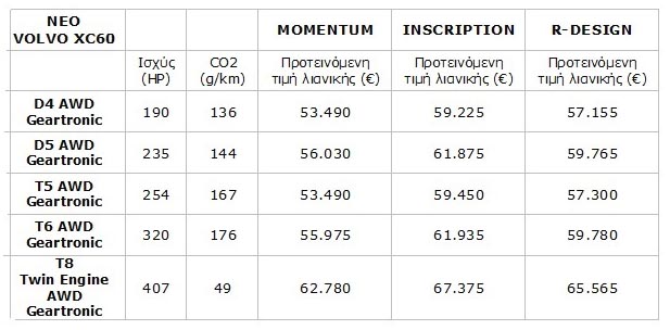 Οι προτεινόμενες τιμές λιανικής για το νέο Volvo XC60, για τις διάφορες εκδόσεις εξοπλισμού, παρουσιάζονται στον παρακάτω πίνακα. Σε όλες τις περιπτώσεις ο κινητήρας έχει χωρητικότητα 1.969 κ.εκ. ενώ ως αυτόματο κιβώτιο ταχυτήτων χρησιμοποιείται το εξαιρετικό, γνωστό και από τη Σειρά 90, Geartronic οκτώ σχέσεων.