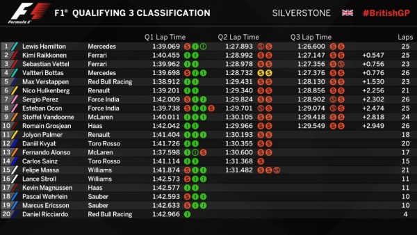 Στο Q3 μετά τον αρχικό γύρο προσπαθειών ο Hamilton ήταν πρώτος με τον Vettel μόλις 2 δέκατα πίσω του. Όλα προμήνυαν μια μεγάλη τελική μάχη αλλά στην δεύτερή του προσπάθεια ο Βρετανός έκανε άλλον έναν σχεδόν τέλειο γύρο όπως σε Μόντρεαλ και Μπακού βελτιώνοντας κατά 6 ολόκληρα δέκατα τον προηγούμενο χρόνο του. Ο Vettel δεν κατάφερε να φέρει στο optimum τη Ferrari πριν την τελευταία του προσπάθεια και ο χρόνος του ήταν αργότερος ακόμη και από αυτόν του Raikkonen ο οποίος είχε πετύχει βελτίωση αντίστοιχη με εκείνη του Hamilton. Τέταρτος ήταν ο Bottas (θα ξεκινήσει 9ος) ενώ ακολούθησαν οι Verstappen, Hulkenberg, Perez, Ocon, Vandoorne και Grosjean.