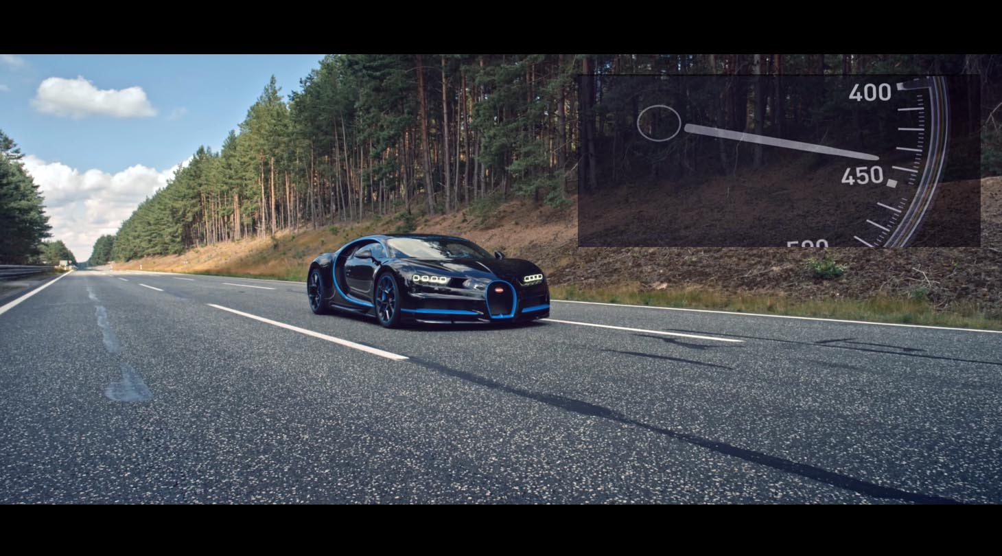 Μετά και το βίντεο όπου δείχνει την Chiron να επιταχύνει στο 0-400 σε μόλις 32,6 δευτερόλεπτα, η γαλλική εταιρεία έδωσε στη δημοσιότητα το επίσημο βίντεο της προσπάθειας για το 0-400-0 χλμ./ώρα με οδηγό τον Montoya. Ωστόσο μεγαλύτερο ενδιαφέρον παρουσιάζει το τέλος του βίντεο, μιας και μετά το «Βe continued» εμφανίζεται το ταχύμετρο της Chiron καρφωμένο στα 440 χλμ./ ώρα, αφήνοντας σαφείς ενδείξεις πως θα είναι το επόμενο ταχύτερο αυτοκίνητο παραγωγής στο κόσμο. Υπενθυμίζεται πως μέχρι τώρα ο κάτοχος του παγκόσμιου ρεκόρ είναι η Bugatti Veyron Super Sport (και όχι το Hennessey που δεν πληρεί τις προϋποθέσεις «μαζικής παραγωγής»), η οποία έχει πετύχει ανώτατη ταχύτητα 431,072 χλμ./ώρα.