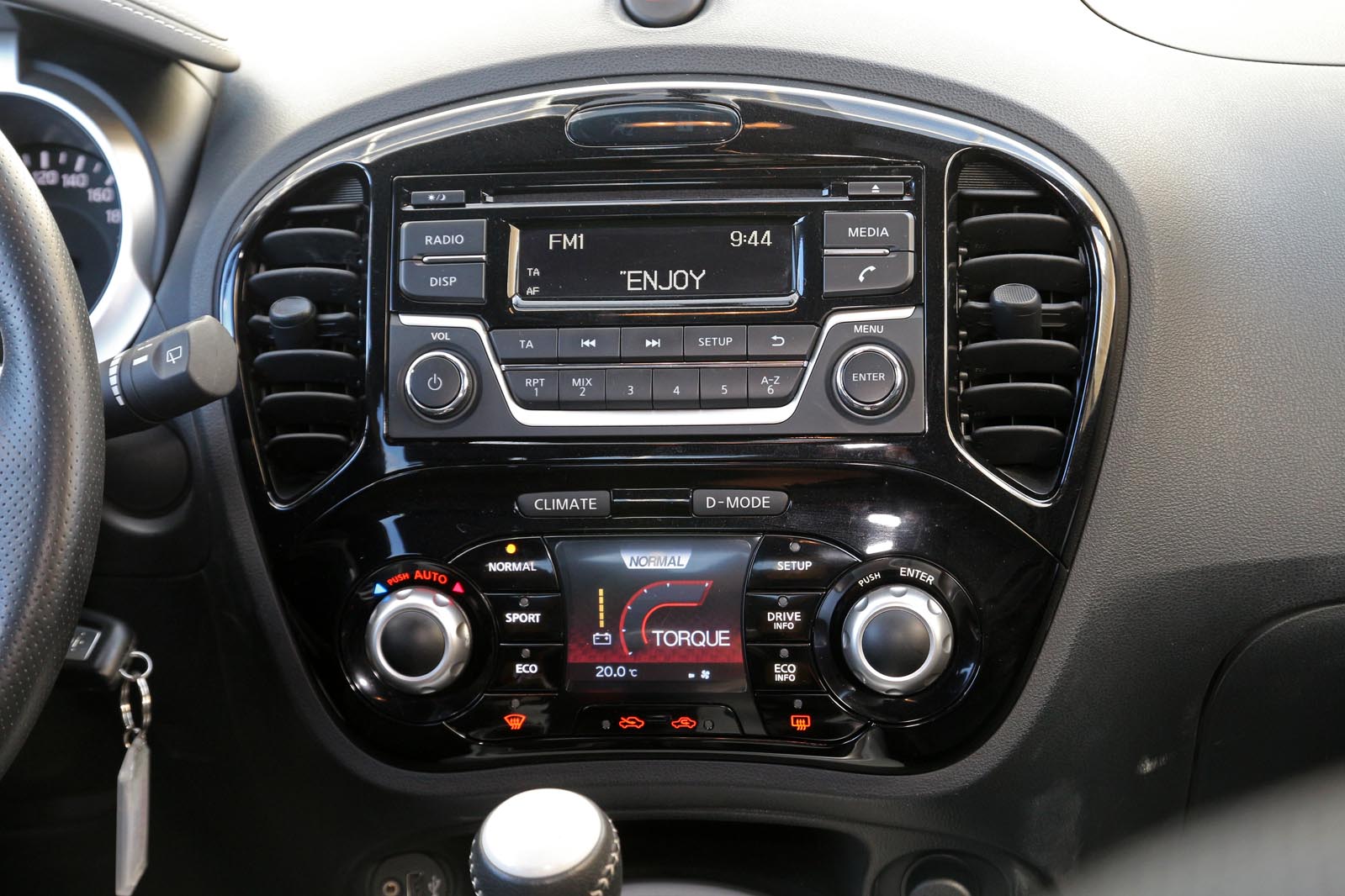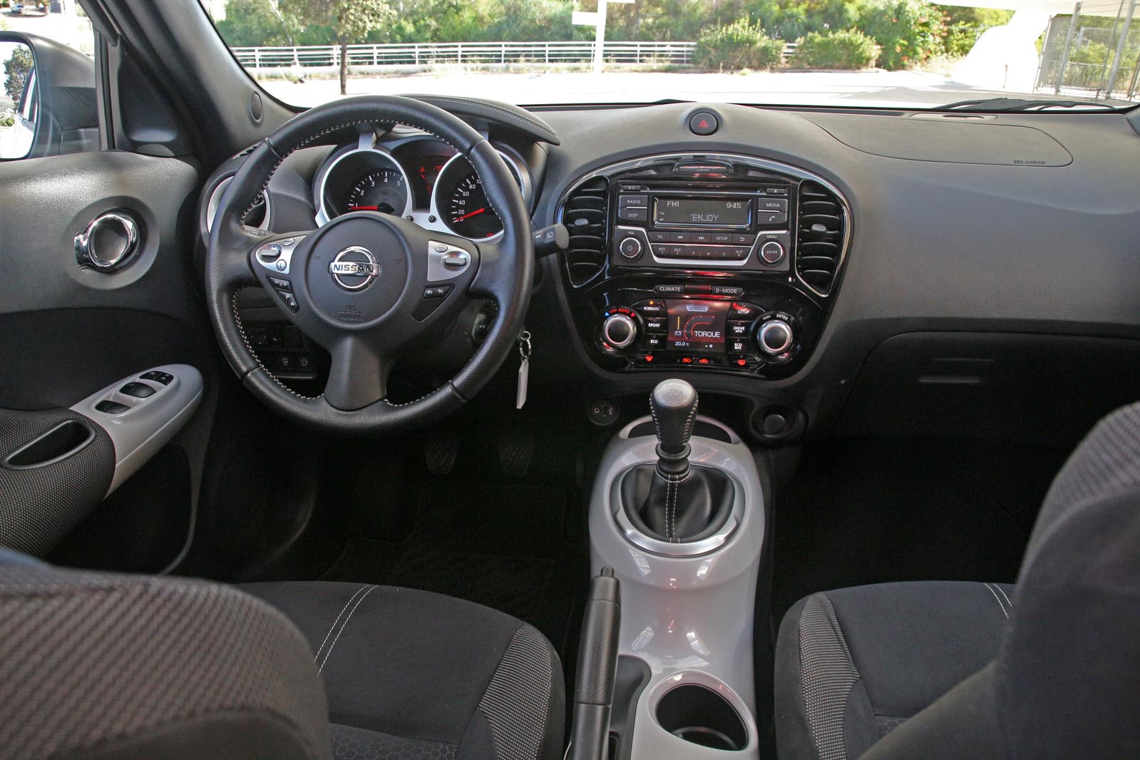 Το Juke, από την άλλη, έχει και αυτό τα ισχυρά του σημεία, όπως την διπλής λειτουργίας οθόνη, που εναλλάσσει τα χειριστήρια του κλιματισμού με αυτά του D-Mode, των οδηγικών modes δηλαδή (Normal, Sport και Eco)του αυτοκινήτου. Τα μπροστινά καθίσματα προσφέρουν καλύτερη πλευρική στήριξη, χωρίς να χάνουν σε άνεση. Τα υλικά είναι αντίστοιχα καλά, υστερεί όμως ελαφρά στην πρακτικότητα των διαθέσιμων χώρων για μικροαντικείμενα.