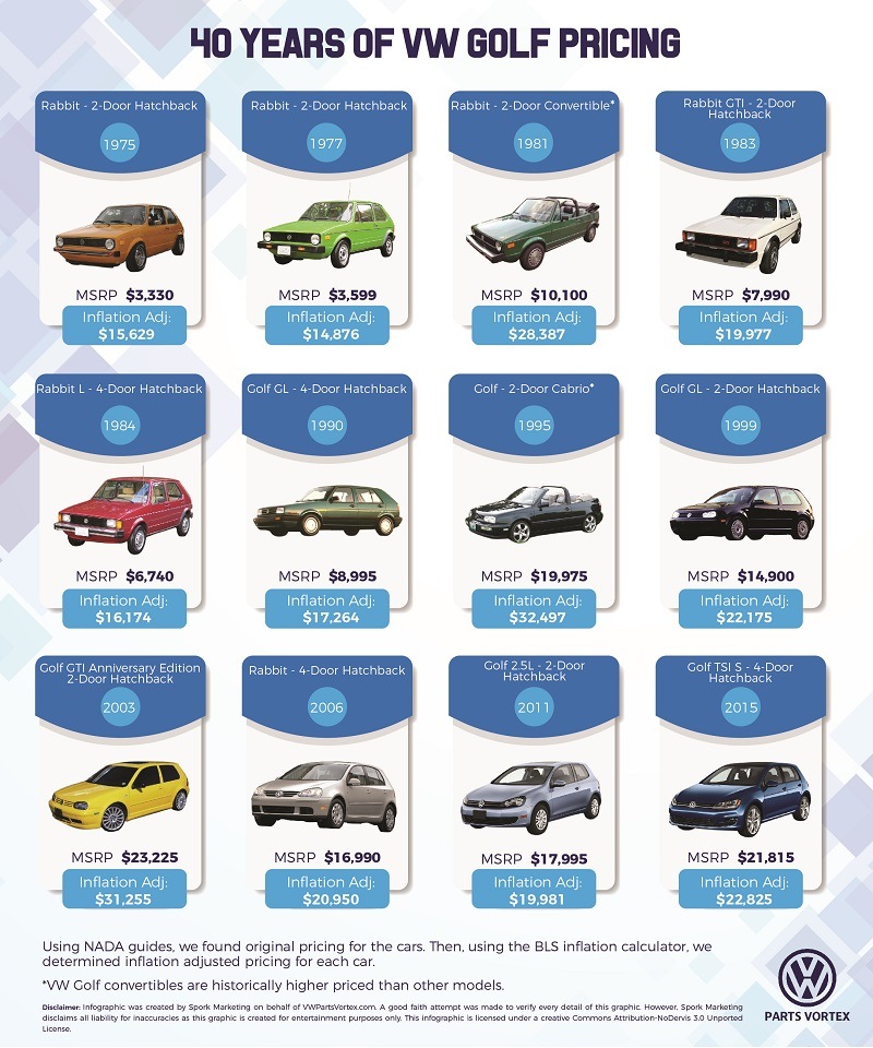 Τα παραπάνω στοιχεία προκύπτουν από στατιστικά της αγοράς των ΗΠΑ αφού στην Ευρώπη, η είσοδος του ευρώ δημιουργεί κάποιες αποκλίσεις. Έτσι, βλέπουμε πόσο κόστιζε το Golf την δεκαετία του 70 και πόσο σήμερα (ουσιαστικά οι διαφορές είναι πολύ μικρές), ειδικά αν σκεφτούμε πως ήταν η πρώτη γενιά με την σημερινή που παρκάρει μέχρι και μόνη της ή έχει ανέπαφο χειρισμό εντολών.