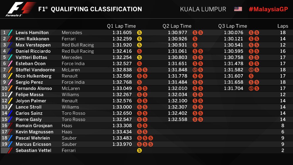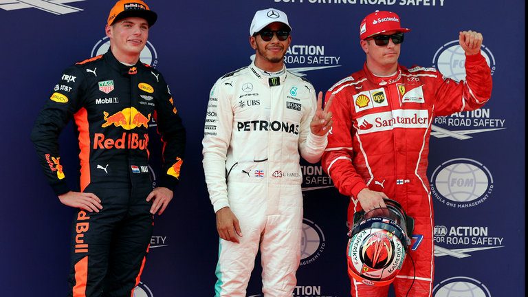 Στην τελευταία περίοδο των κατατακτήριων δοκιμών, με τις θερμοκρασίες να πέφτουν η W08 του Hamilton ξαφνικά «ζωντάνεψε». Ο Βρετανός δεν άφησε την ευκαιρία να πάει χαμένη και στην πρώτη από τις δύο προσπάθειές του έκανε έναν σχεδόν τέλειο γύρο (μόνη παραφωνία ένα ελαφρύ μπλοκάρισμα του εσωτερικού τροχού στην πολύ δύσκολη ανάποδης καμπυλότητας τελευταία στροφή) κατακτώντας την 9η φετινή του pole position. Ο Raikkonen έκανε επίσης έναν πολύ όμορφο γύρο στη δεύτερη προσπάθειά του (μπλόκαρε κι αυτός τον εσωτερικό τροχό πριν την τελευταία στροφή) αλλά αρκέστηκε στη δεύτερη θέση για μόλις 45 χιλιοστά του δευτερολέπτου. Κρίνοντας από τη μέση διαφορά Vettel-Raikkonen στις φετινές κατατακτήριες δοκιμές θα μπορούσαμε να πούμε με ασφάλεια ότι η pole ήταν προορισμένη για τον Γερμανό σήμερα. Όμως… Οι δύο Red Bull κατέλαβαν τη δεύτερη σειρά εκκίνησης μπροστά από τον Bottas που δεν μπόρεσε να βρει απάντηση στα προβλήματα της W08. Η πρώτη δεκάδα συμπληρώθηκε από τους Ocon, Vandoorne, Hulkenberg, Perez και Alonso.