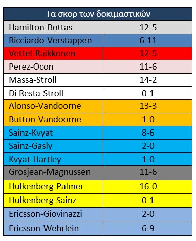 Είναι εμφανές ότι ο Lewis μετά το καλοκαιρινό διάλειμμα έχει ξεκλειδώσει όλα τα μυστικά της W08 και μπορεί να εκμεταλλεύεται όλο το δυναμικό της, ιδίως στις κατατακτήριες δοκιμές. Το ίδιο δε θα μπορούσε να ειπωθεί, αντιθέτως, για τον teammate του. Η εικόνα του, τρίτου σήμερα, Bottas στους τελευταίους αγώνες δεν έχει καμία σχέση με ότι μας είχε συνηθίσει ο Φιλανδός μέχρι και την Ουγγαρία. Δεν μπορούμε να γνωρίζουμε αν αυτό οφείλεται σε κάποια αλλαγή στην W08 που ευνοεί το οδηγικό στιλ του Hamilton, αλλά ακόμη κι έτσι να είναι δεν μπορεί να δικαιολογήσει πλήρως διαφορές της τάξεως του μισού δευτερολέπτου ανά γύρο.