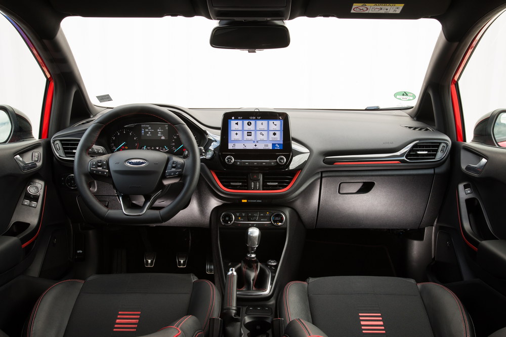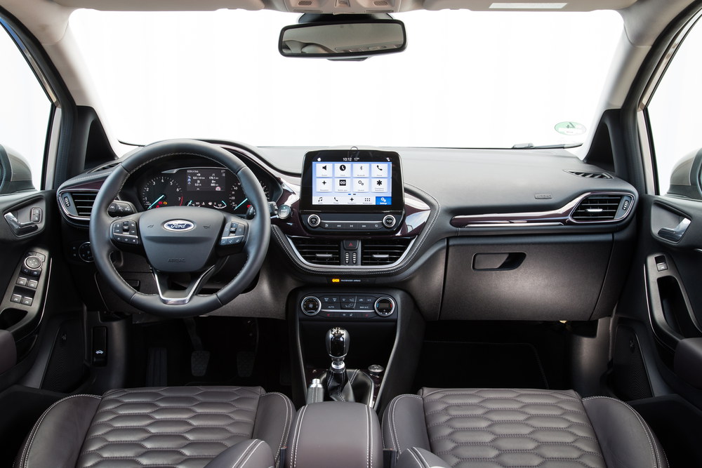 Fiesta Vignale. H πολυτελής έκδοση του νέου Fiesta, η Vignale, ξεχωρίζει από τις ειδικής σχεδίασης ζάντες και το λουσάτο διάκοσμο με είσοδο δίχως χρήση κλειδιού (στάνταρ το σύστημα KeyFree). Η αίσθηση της πολυτέλειας τονίζεται ως ένα βαθμό από τις δερμάτινες επενδύσεις των καθισμάτων με τις χαρακτηριστικές ραφές, καθώς και από το δέρμα στο ταμπλό και στον επιλογέα ταχυτήτων. Η ευανάγνωστη οθόνη αφής 8,0’’ του συστήματος infotainment SYNC 3 δεσπόζει στο κέντρο του ταμπλό, ενώ από κει και πέρα ο εξοπλισμός ασφάλειας, υποβοήθησης, εξυπηρέτησης και διασύνδεσης είναι πλήρης.
