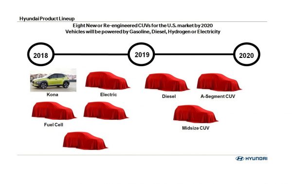 Η Hyundai λέει πως θα χρησιμοποιήσει όλες τις υπάρχουσες τεχνολογίες, με κινητήρες βενζίνης και πετρελαίου, ηλεκτρικά και υβριδικά, καθώς και fuel-cells. Σχετικά με το ντίζελ είναι πολύ πιθανό να υπάρξει η παραγωγή ενός pick-up που θα ονομάζεται Santa Cruz, αν και δεν έχει επιβεβαιωθεί ακόμη επίσημα. Ενδιαφέρον έχει και το κόμπακτ crossover που θα λανσαριστεί το 2020.
