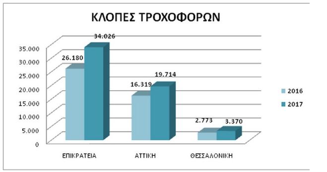 Σύμφωνα με στοιχεία που έδωσε στην δημοσιότητα η Ελληνική Αστυνομία το 2017 οι κλοπές αυτοκινήτων χτύπησαν ρεκόρ και έφτασαν τις 34.026 περιπτώσεις. Σε σχέση με το 2016 αυτό το νούμερο θεωρείται πολύ υψηλό και σε σύγκριση με τις 26.180 καταγεγραμμένες κλοπές εμφανίζεται αύξηση κατά 30%.