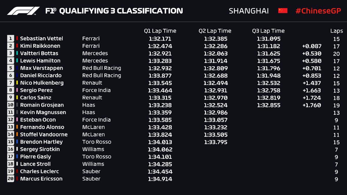 Σε μία πίστα όπου η Mercedes πρόβαλε πριν την έναρξη του τριημέρου ως το ξεκάθαρο φαβορί, οι δύο SF71H αποδείχτηκαν ακόμη πιο δυνατές και από τον προηγούμενο αγώνα συνδυάζοντας επιβλητική ισχύ κατά τις επιταχύνσεις αλλά και ιδανικό handling στις πολλές και βασανιστικές αλλαγές διεύθυνσης του Shanghai International Circuit. Ο Sebastian Vettel για άλλη μία φορά κράτησε τον καλύτερο του γύρο για το τέλος πετυχαίνοντας έτσι την 52η pole της καριέρας του με χρόνο 1:31.095.