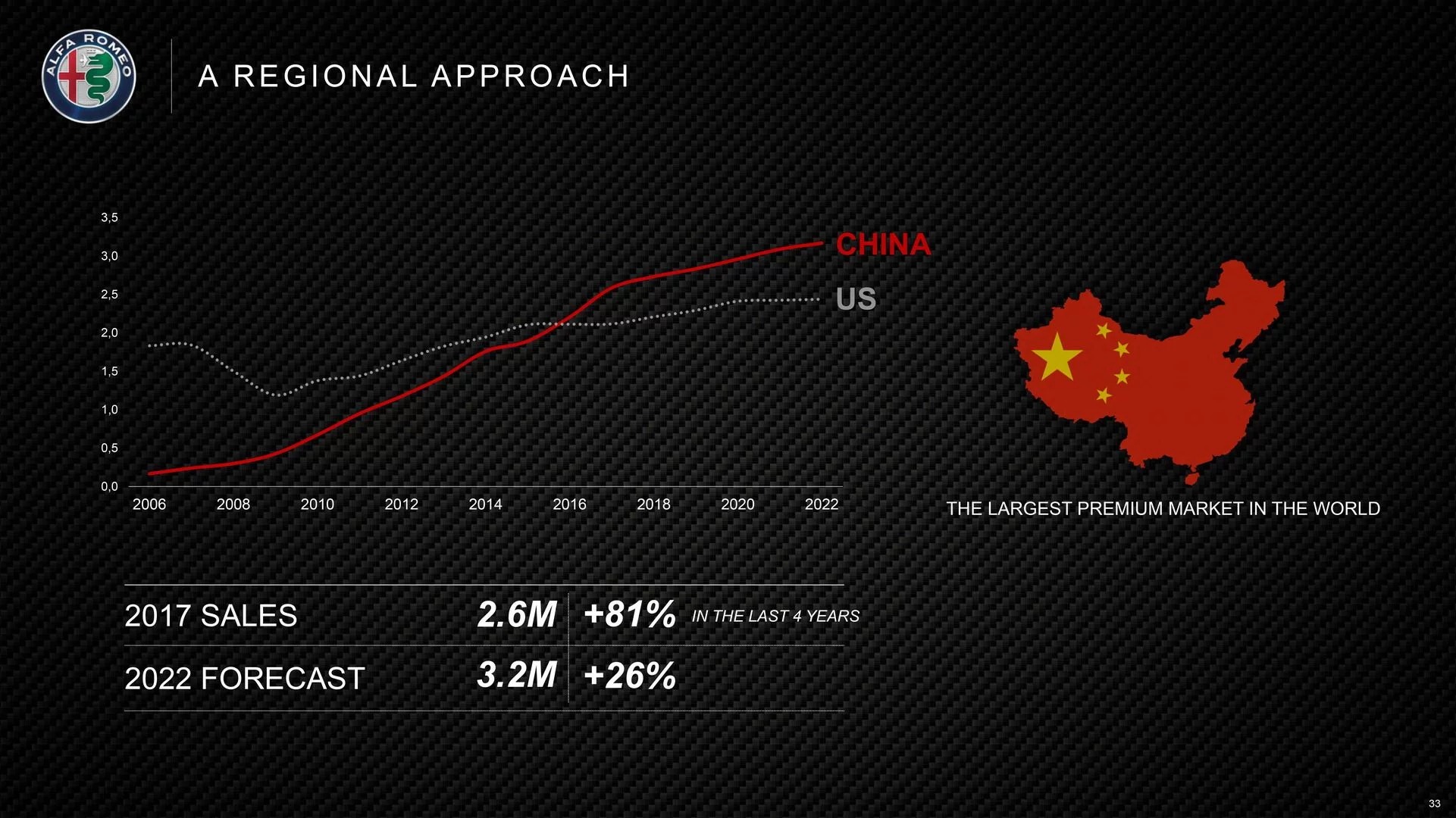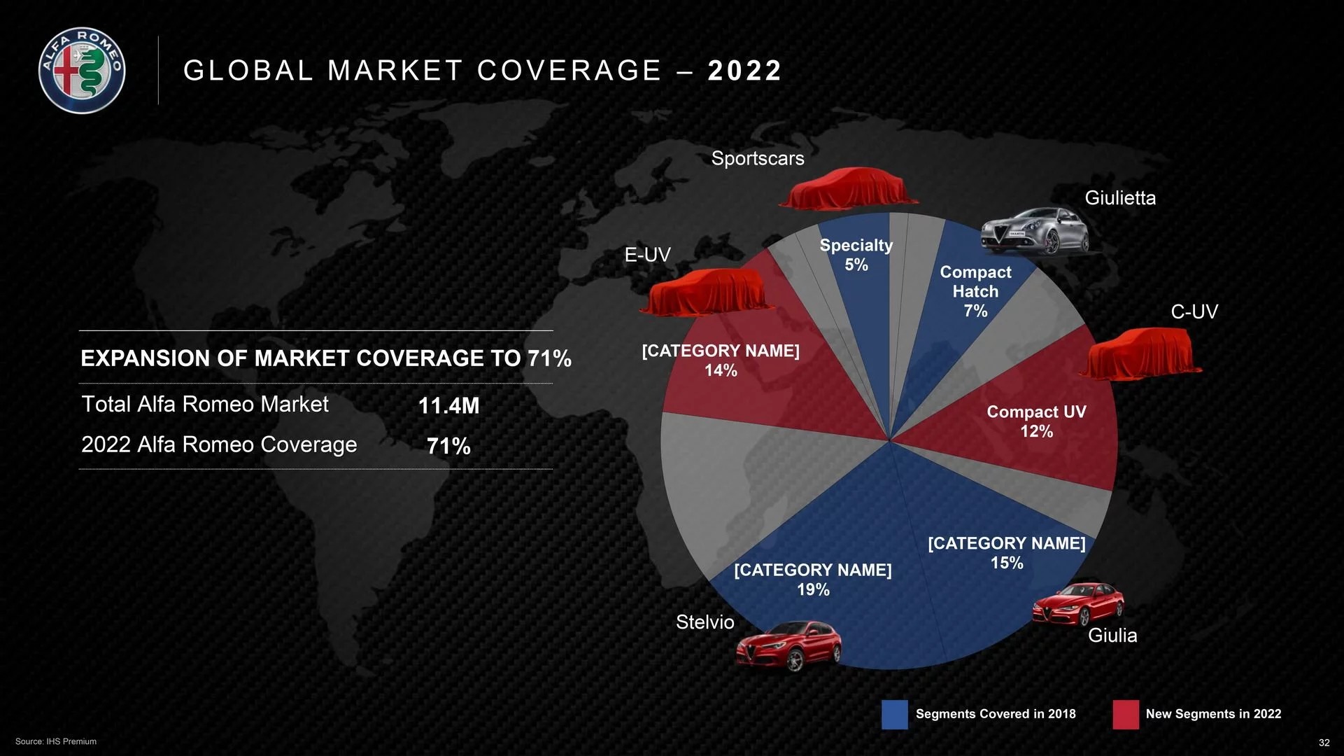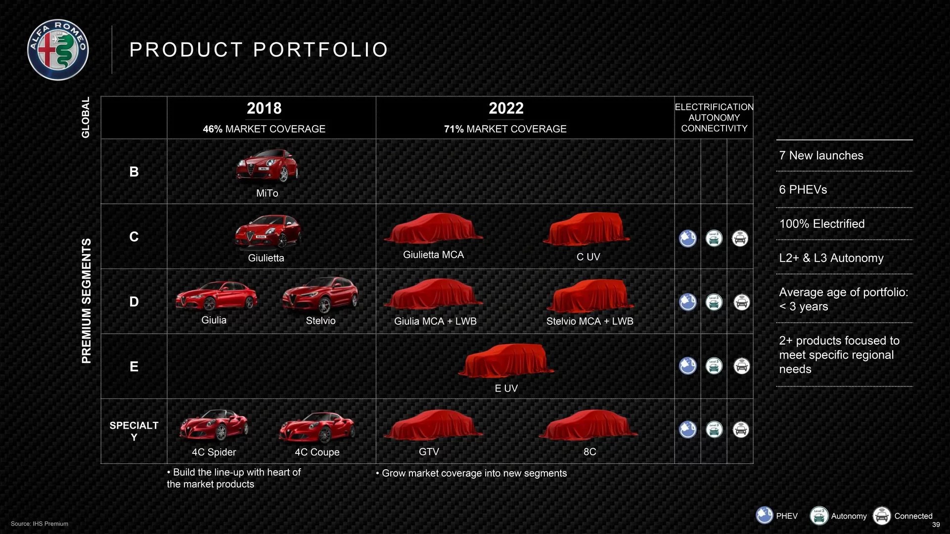 Μέχρι το 2022 θα υπάρξουν 7 νέα λανσαρίσματα και 6 plug-in υβριδικές εκδόσεις. Όπως μπορείτε να δείτε στην παραπάνω εικόνα μέχρι το 2022 θεωρητικά θα έχει προστεθεί η νέα γενιά της Giulietta καθώς και ένα κόμπακτ SUV με σπορ καταβολές. Θα δοθεί μεγαλύτερη έμφαση στην αγορά της Κίνας.