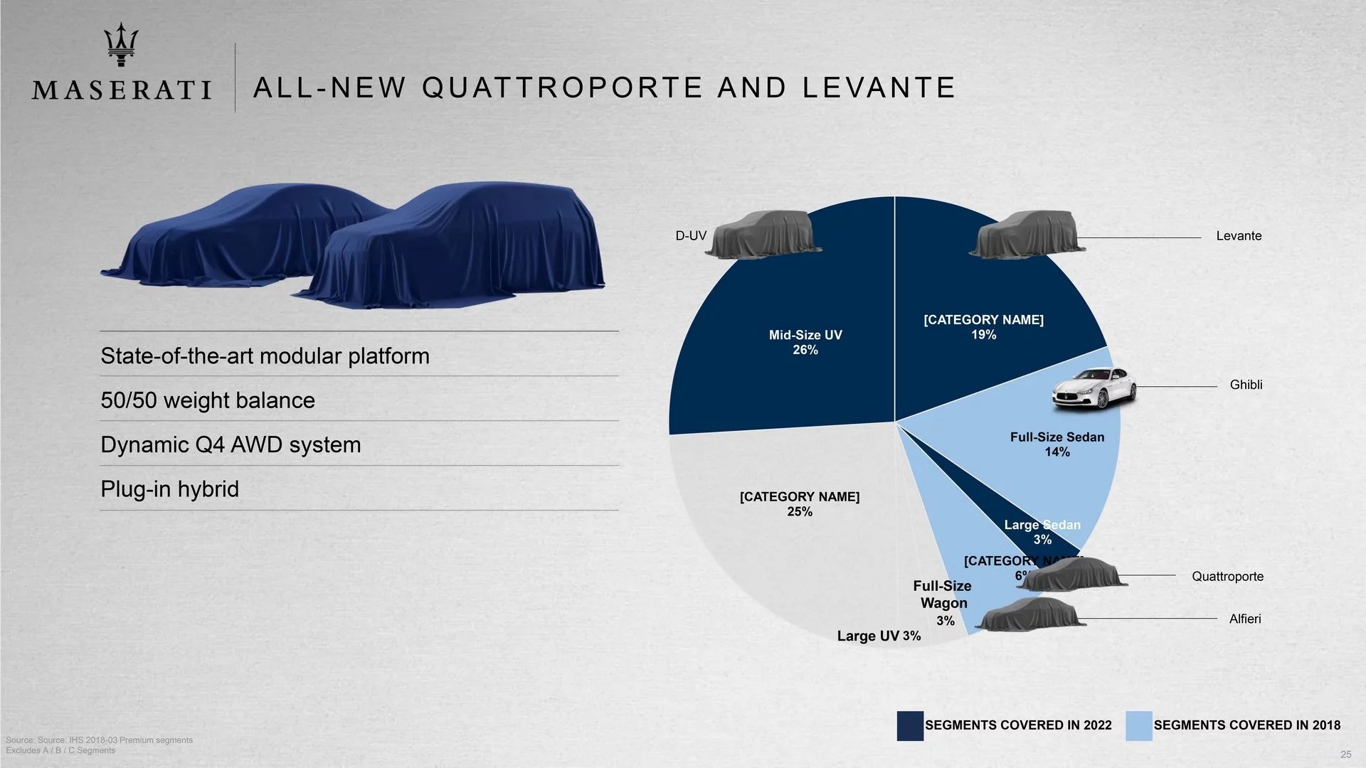 Η Maserati θα αποκτήσει ένα μεσαίο κουπέ κάτω από την Levante, ενώ θα υπάρξει νέα γενιά Ghibli καθώς και νέα Quattroporte. Μέχρι το 2022 θα έχει μπει στην παραγωγή η σαγηνευτική Alfieri σε κουπέ και κάμπριο έκδοση που θα έχει τελική στα 300+ χλμ./ώρα και 0-100 κάτω από τα 2 δευτερόλεπτα.