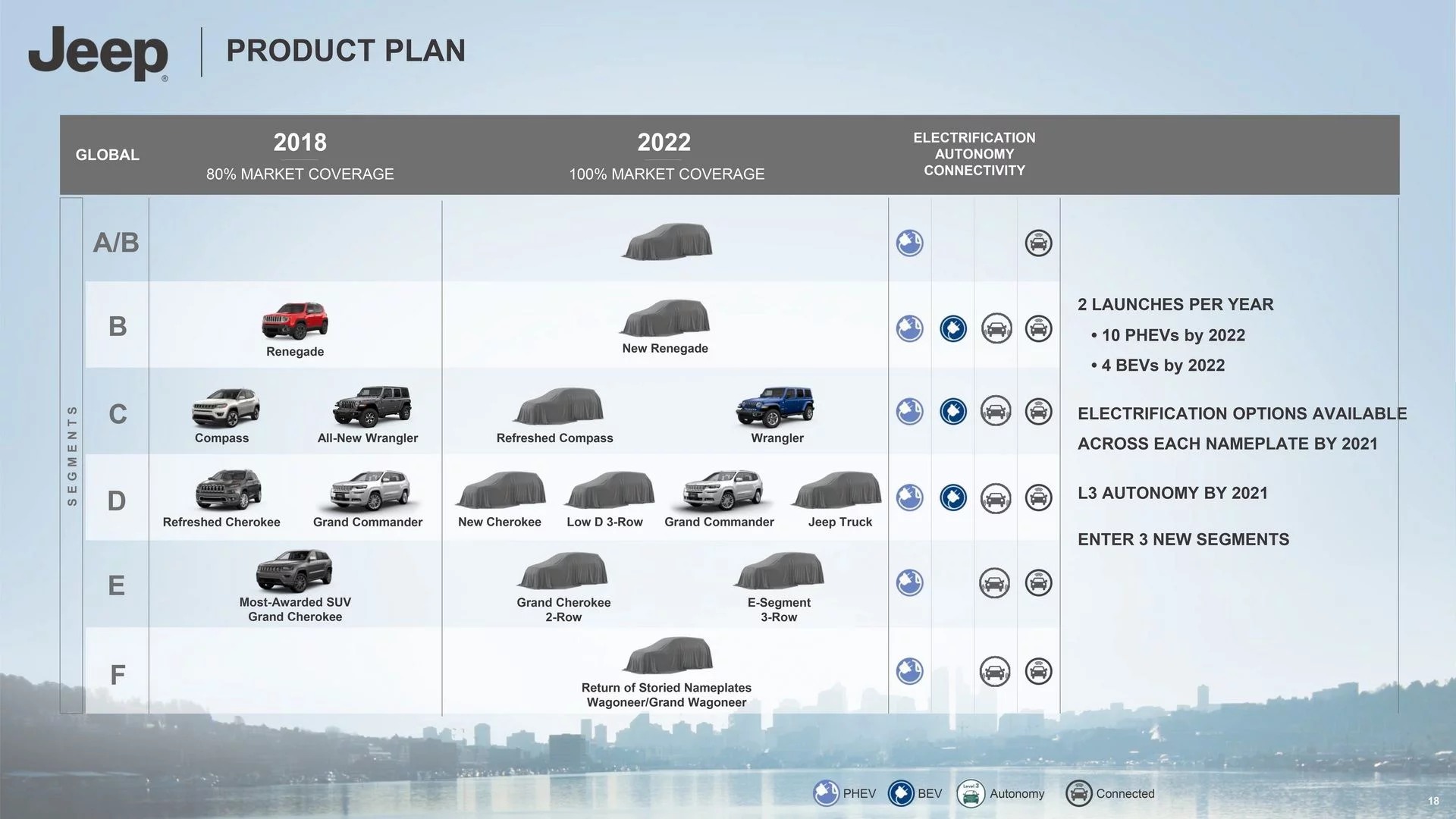 Το πρώτο και σημαντικότερο είναι πως στην FCA το μέλλον της Jeep έχει ειδικό βάρος και για αυτό θα παρουσιάζονται 2 νέα μοντέλα κάθε χρόνο και μέχρι το 2022. Αυτό που ξεχωρίζει είναι ένα compact SUV (λανσάρισμα το 2022!) κάτω από το Renegade. Το τελευταίο θα περάσει στην επόμενη γενιά από το 2020 και μετά, ενώ θα υπάρξει και αισθητική ανανέωση του Compass.