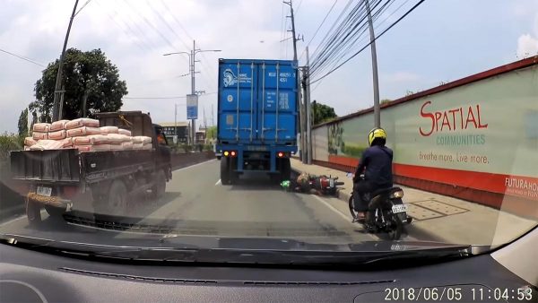 Ο πρωταγωνιστής του βίντεο επιχειρεί κάτι πολύ συνηθισμένο. Να προσπεράσει από δεξιά. Ωστόσο δεν υπολογίζει καλά την πορεία του και χάνει την ισορροπία του πέφτοντας μπροστά από τον πίσω τροχό του φορτηγού και ενώ περνά πάνω από το κεφάλι του! Κανείς δεν θέλει να φανταστεί για μια στιγμή τι θα είχε γίνει αν ο μοτοσικλετιστής δεν φορούσε το κράνος του.