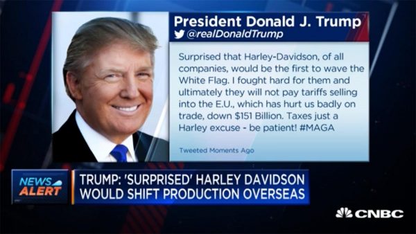 Ο Trump τα έχει βάλει και με την Harley Davidson με την τελευταία να ανακοινώνει πως εξετάζει την μεταφορά των εργοστασίων παραγωγής της στην Ταϊλάνδη προκειμένου να αποφύγει το 25% των δασμών στον χάλυβα και 10% στο αλουμίνιο που εισάγονται στις ΗΠΑ από την Ε.Ε. Ο Αμερικανός Πρόεδρος θεωρεί αυτή την στάση «προδοτική» και πως αν γίνει κάτι τέτοιο θα απαντήσει με επιπλέον φορολογικά αντίποινα. Αξιοσημείωτο είναι πως ο Trump είχε διαγράψει πρόστιμο 3 εκ. δολαρίων στην Harley Davidson.