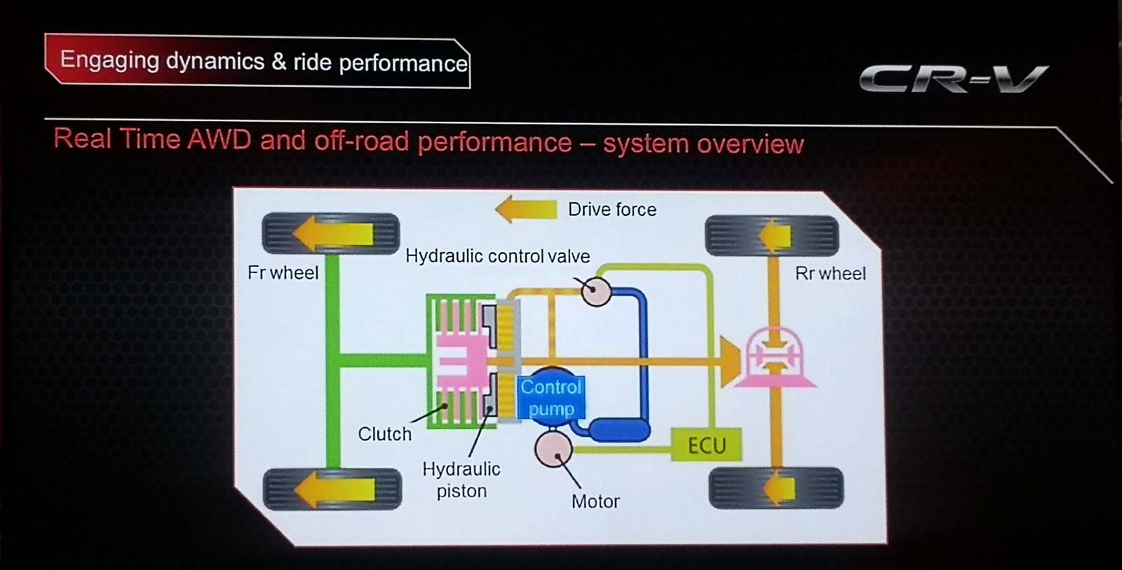 Και περνάμε στο σασί του νέου CR-V που βασίζεται σε μια εξελιγμένη πλατφόρμα με μεγαλύτερη στρεπτική δυσκαμψία κατά 25% και μεγάλη έμφαση στην μείωση του απόβαρου (από 1.501 κιλά) και των χαρακτηριστικών NVH. Όπως και στην περίπτωση του νέου Civic οι μηχανικοί έχουν δημιουργήσει ένα πολύ ποιοτικό SUV με κορυφαία ποιότητα κύλισης και την ανάρτηση (με γόνατα MacPherson μπροστά, πολλαπλοί σύνδεσμοι πίσω) να πετυχαίνει την χρυσή τομή ανάμεσα στο κράτημα και στην άνεση λειτουργώντας υποδειγματικά. Το ηλεκτρομηχανικά υποβοηθούμενο τιμόνι έχει δύο πινιόν (όπως και στο Civic) και προσφέρει εξαιρετική πληροφόρηση με γεμάτη ακρίβεια. Το σύστημα τετρακίνησης «Real Time AWD» βασίζεται σε έναν ηλεκτρονικά ελεγχόμενο πολύδισκο συμπλέκτη που σφίγγει υδραυλικά για να μεταφέρει την ροπή έως 60% στους πίσω τροχούς (+10% και 550 Nm σε απαιτητικές συνθήκες).