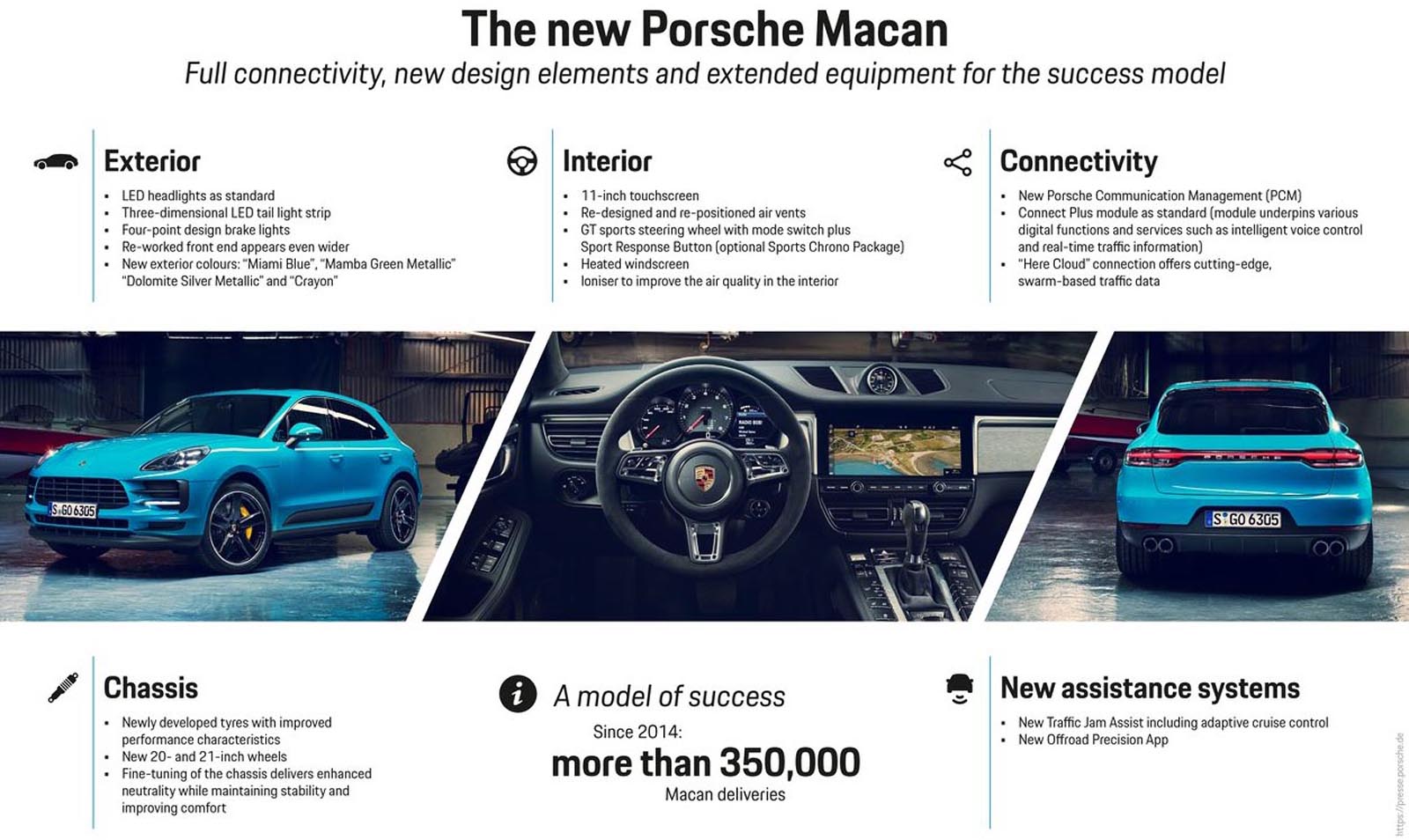 Μετά από πολλά teaser στοιχεία τελικά η Porsche παρουσίασε την Macan με το ανανεωμένο παρουσιαστικό και το αναβαθμισμένο εσωτερικό με τη νέα touch-screen διάστασης 11 ιντσών του καινούργιου Porsche Communication Management (PCM). Οι αλλαγές συνάδουν στο πρότυπο ενός τυπικού facelift με την ειδοποιό διαφορά να εντοπίζεται στα LED φωτιστικά σώματα και τα πίσω να έχουν μία γεφυρωμένη ρίγα όπως στις 718.