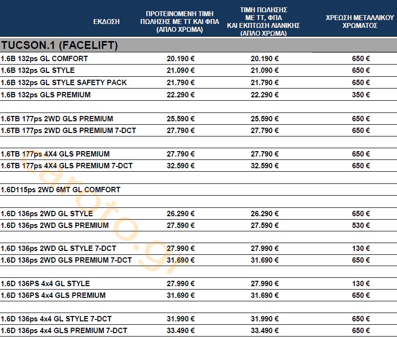 Την γκάμα συμπληρώνουν οι ντίζελ εκδόσεις 1.6D με 115 ίππους (αυτή η έκδοση αναμένεται) και η ισχυρότερη με 136 ίππους. Παρακάτω θα δείτε αναλυτικά στον πίνακα τις τιμές ανά έκδοση. Όπως κάθε Hyundai έτσι και το Tucson προσφέρεται με 5 χρόνια εγγύηση και απεριόριστο αριθμό χιλιομέτρων. Εδώ μπορείτε να κατεβάσετε τον αναλυτικό τιμοκατάλογο και να δείτε στα «εξελόφυλλα» τον εξοπλισμό ανά μοντέλο και έκδοση. Εδώ όλες οι τιμές των νέων μοντέλων.