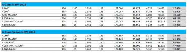 Οι τιμές για το νεότερο μέλος της οικογένειας compact αυτοκινήτων της Mercedes-Benz ξεκινούν από 33.041 ευρώ για την A 180d με 85 kW (116 hp) και αυτόματο κιβώτιο ταχυτήτων (μικτή κατανάλωση καυσίμου 4,1 l/100 km, μικτές εκπομπές CO2 108 g/km). Η παρουσίαση στην αγορά αναμένεται στις αρχές του 2019. Η νέα A-Class Saloon θα κατασκευάζεται στα εργοστάσια Aguascalientes του Μεξικό και Rastatt της Γερμανίας, ενώ αναπτύχθηκε στο Sindelfingen της Γερμανίας. Το νέο μοντέλο θα παρουσιαστεί στο κοινό για πρώτη φορά στην Έκθεση Αυτοκινήτου στο Παρίσι (4-14 Οκτωβρίου 2018). Δείτε εδώ τον τιμοκατάλογο Mercedes, εδώ οι τιμές όλων των επιβατικών.
