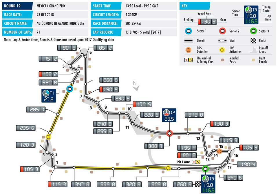 Το σιρκουί κατασκευάστηκε το 1959 μέσα στην έκταση του πάρκου Magdalena Mixhuca στο Μέξικο σίτυ. Φιλοξενούσε Grand Prix από το 1963 ως το 1970 και από το 1986 ως το 1992. Αναμορφώθηκε από τον Tilke και επέστρεψε στο καλεντάρι το 2015, ως άμεση συνέπεια της υψηλότατης δημοτικότητας που απολαμβάνει στη χώρα του ο Sergio Perez αλλά και λόγω των αρκετών και υψηλού προφίλ Μεξικανών χορηγών που έχουν επενδύσει στο σπορ. Η πίστα βρίσκεται σε υψόμετρο 2.229 μέτρων (μακράν το μεγαλύτερο από τις πίστες του πρωταθλήματος) κάτι που συνεπάγεται μικρότερη πυκνότητα ατμοσφαιρικού αέρα και άρα μεγάλα προβλήματα απόδοσης στις μονάδες ισχύος με ταυτόχρονη διαφοροποίηση των αεροδυναμικών στοιχείων που απαιτούνται από τα μονοθέσια. Ωστόσο η 4,304 χιλιομέτρων διαδρομή είναι από τις πιο επίπεδες στο πρόγραμμα (μόλις 2,8 μέτρα απέχουν το υψηλότερο από το χαμηλότερο σημείο) με τις κύριες αλλαγές που έχει υποστεί κατά την ανακατασκευή της να εντοπίζονται στην διαφοροποίηση των Esses και την αλλαγή της περίφημης τελευταίας στροφής Peraltada.