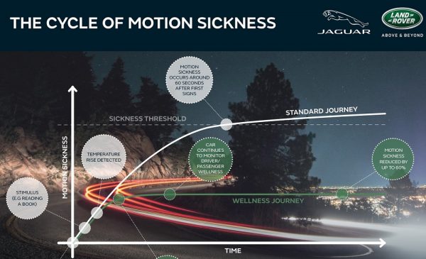 Οι Jaguar και Land Rover τρέχουν μία μελέτη επ’ αυτού, με στόχο να κατανοήσουν τους λόγους που προκαλείται η ναυτία και να περιορίσουν τουλάχιστον κατά 60% τις συνέπειές της. Μέχρι στιγμής έχουν μαζέψει δεδομένα από 24.000 χλμ. δοκιμών, δημιουργώντας έναν αλγόριθμο που θα παρακολουθεί το «wellness score» του κάθε επιβάτη ξεχωριστά. Παράμετροι όπως η νευρικότητα στην οδήγηση, οι πλευρικές επιταχύνσεις αλλά και η συμπεριφορά των επιβατών, όπως για παράδειγμα η ανάγνωση email, παίζουν το ρόλο τους εδώ.