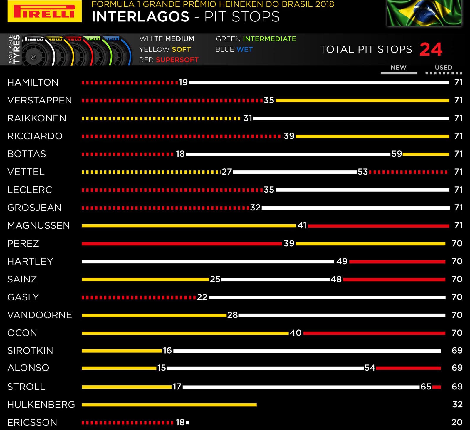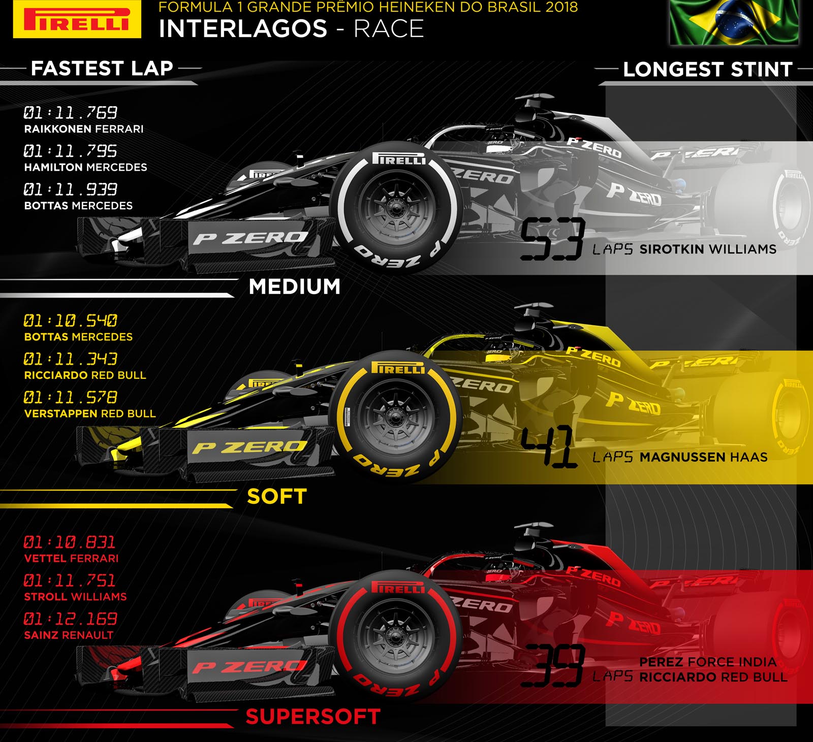 Υπήρχαν μόνο δύο περιπτώσεις στις οποίες θα είχε κάποια λογική η εκκίνηση των SF71H με τα κίτρινα Pirelli. Η πρώτη θα ήταν εάν οι Vettel-Raikkonen μπορούσαν στους επιπλέον γύρους που θα έμεναν στην πίστα κατά το πρώτο τους stint να πετύχουν το overcut στις Mercedes, πράγμα που δεν έχει συμβεί ποτέ στο Interlagos τα τελευταία χρόνια, ή εναλλακτικά πριν τη μοναδική τους στάση να σημειώνουν αντίστοιχους χρόνους με τις ευρισκόμενες σε φρέσκα Medium, W09 ώστε στα τελευταία στάδια του αγώνα τα κόκκινα μονοθέσια να επιτεθούν έχοντας περισσότερη ζωή στα δικά τους ελαστικά.