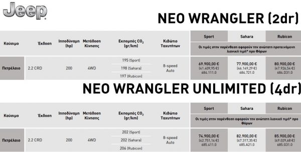 Αναφορικά με τις επιδόσεις, το 0-100 χλμ./ώρα σε ένα τετράπορτο Sahara θα επιτυγχάνεται σε μόλις 9,6 δλ, ενώ η τελική του οχήματος θα αγγίζει τα 180 χλμ./ώρα. Λίγο αργότερα θα ακολουθήσει και η βενζινοκίνητη εκδοχή με το δίλιτρο turbo σύνολο των 268 ίππων και 400 Nm. Παρακάτω αναλυτικά οι τιμές πώλησης του νέου Jeep Wrangler.