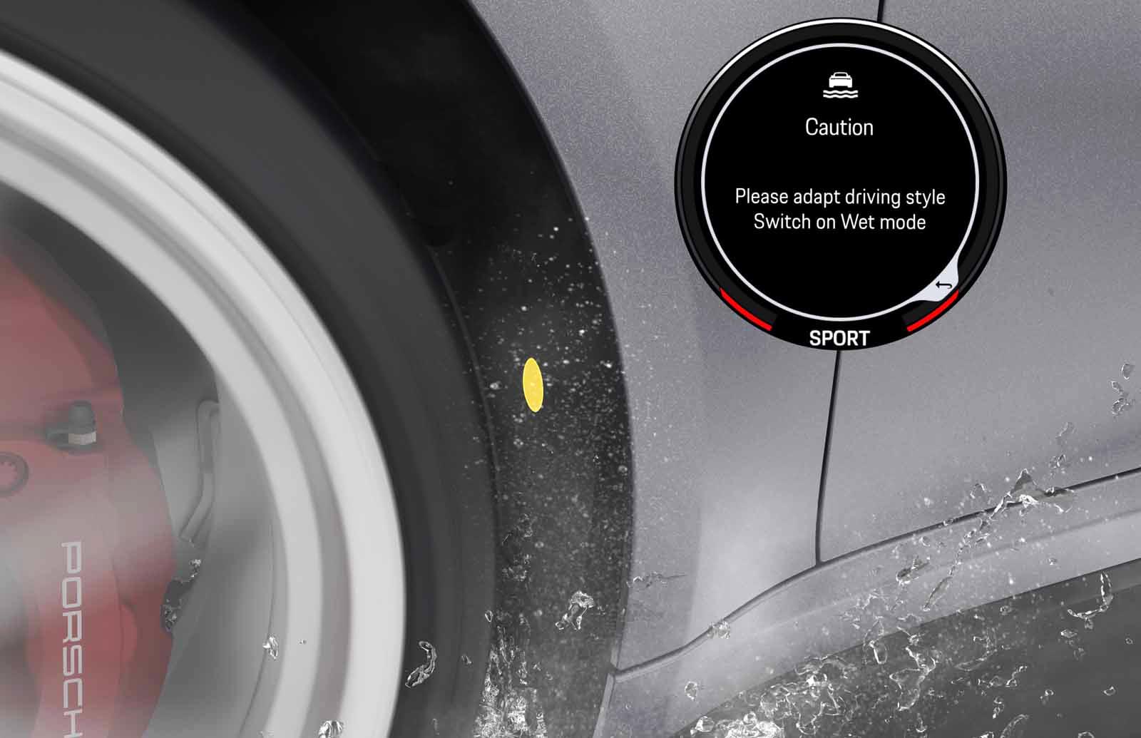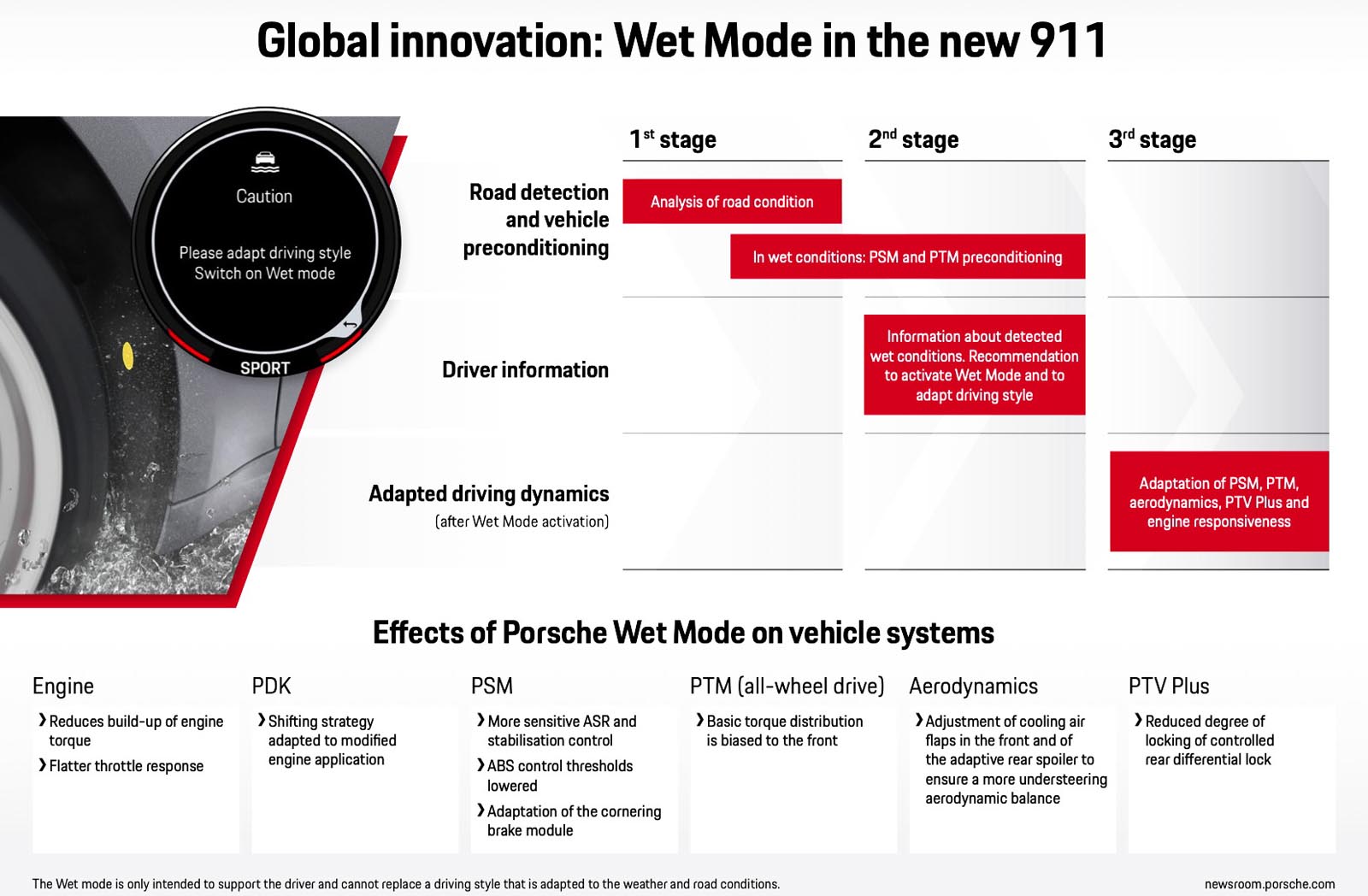 Αν και η Ferrari διαθέτει εδώ και χρόνια ένα παρόμοιο σύστημα για καλύτερο έλεγχο στο βρεγμένο (και αποφυγή υδρολίσθησης), η Porsche έχει πάει το σύστημα ένα βήμα παραπέρα στη νέα 911. Πέρα από τους αισθητήρες υγρασίας στο παρμπρίζ χρησιμοποιεί ακουστικούς αισθητήρες στους θόλους των τροχών που αντιλαμβάνονται τον θόρυβο και την ένταση που κάνει το σπρέι νερού κατά την περιστροφή των τροχών. Έτσι, το σύστημα προτρέπει τον οδηγό με μία ένδειξη δίπλα από το στροφόμετρο να ενεργοποιήσει το Wet Mode πιέζοντας ένα διακόπτη στην κεντρική κονσόλα ή στο τιμόνι.