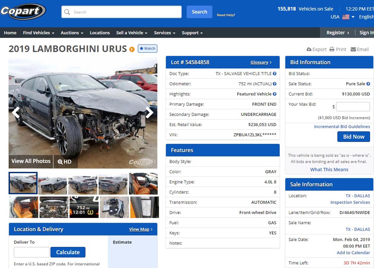 Αν και δεν υπάρχουν πολλές λεπτομέρειες για το πως κατέληξε σε αυτά τα χάλια η Urus που βλέπετε, η αμερικανική ιστοσελίδα compart.com έχει ήδη δεχθεί έως τώρα χτύπημα για 130.000 δολάρια! Ο ιδιοκτήτης της αναφέρει πως η τιμή με τα εξτρά για αυτή την Urus είναι στις 236.000 δολάρια και η δημοπράτηση λογικά θα ανέβει ψηλότερα αφού θέλει ακόμη τρεις ημέρες για να ολοκληρωθεί.