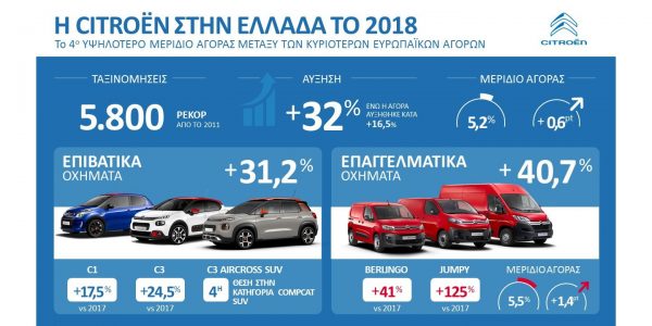 Στην ελληνική αγορά, οι κατακτήσεις διαδέχονται η μια την άλλη, με ανοδική πορεία στην αναγνωρισιμότητα και την εμπορική επιτυχία των μοντέλων Citroen. Η πολύ καλή πορεία των αυτοκινήτων της Citroen στη χώρα μας, έχει φέρει μια από τις καλύτερες επιδόσεις σε εμπορικό επίπεδο της Ευρωπαϊκής αγοράς για το 2018. Για την ακρίβεια, η Citroen έχει βελτιώσει το μερίδιό της στην Ελληνική αγορά κατά 0,6 μονάδες, φτάνοντας στο 5,2% που είναι η 4η καλύτερη επίδοση μεταξύ των κυριότερων Ευρωπαϊκών αγορών!